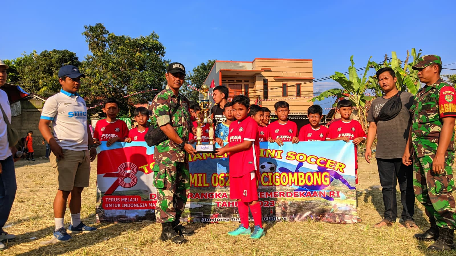 Bogor (HSB) – Rabu, 16 Agustus 2023,Dalam rangka memperingati HUT-RI ke -78 dan upaya menumbuhkan semangat kebangsaan, Koramil 0621-12/Cijeruk-Cigombong bekerjasama dengan Karang Taruna Desa Cigombong Kabupaten Bogor menggelar kegiatan turnamen Mini Soccer Danramil Cup yang berlangsung mulai Senin 14 hingga Rabu 16 Agustus 2023 di Kampung Bata Alam Cigombong yang diikuti oleh 6 peserta team tingkat Sekolah Dasar.