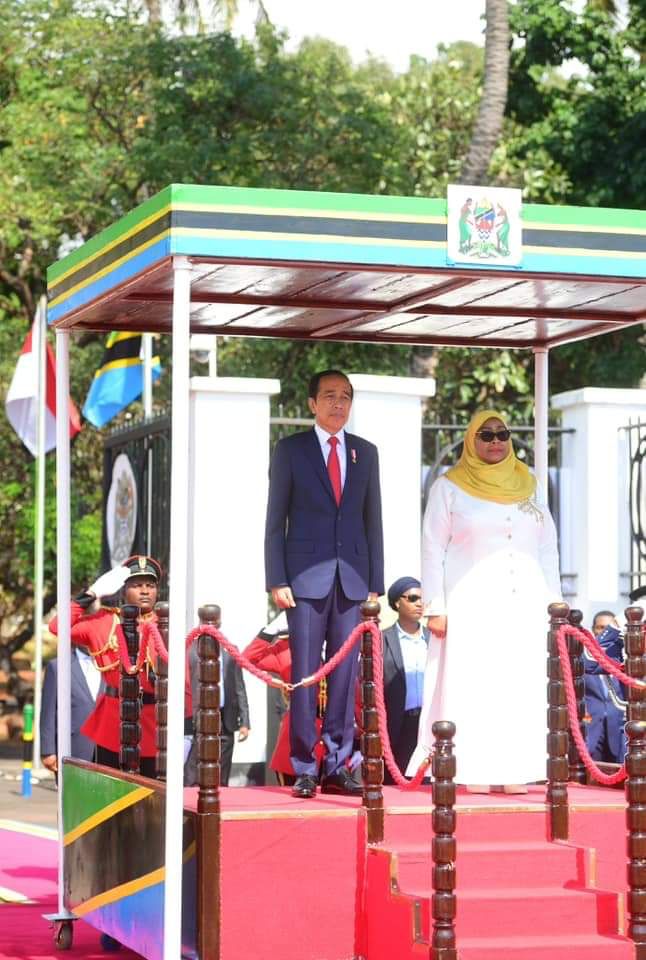 Kedua pemimpin negara kemudian mengikuti jalannya upacara penyambutan dengan iringan lagu kebangsaan masing-masing negara serta 21 dentuman meriam kehormatan. Setelahnya, Presiden Jokowi dipersilakan oleh Presiden Samia untuk melakukan inspeksi pasukan.