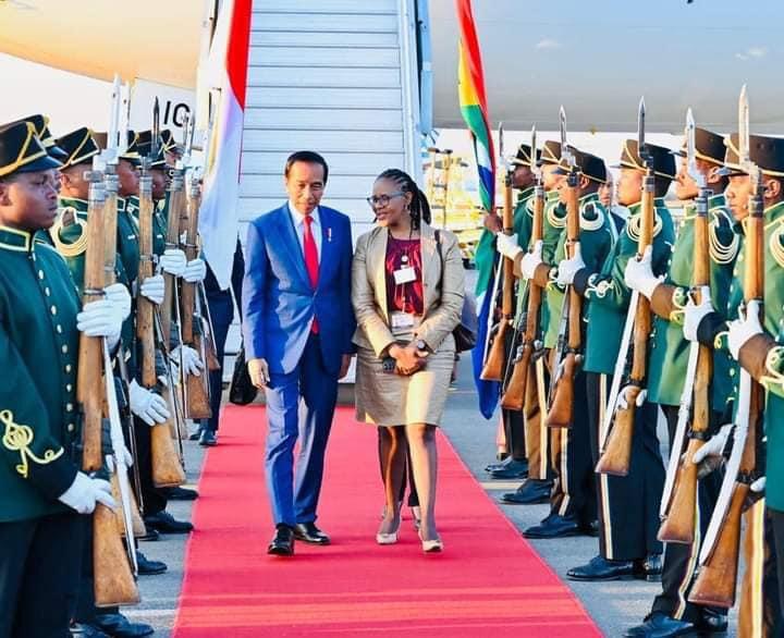 Di bawah tangga pesawat, Presiden Jokowi disambut langsung oleh Menteri Kehutanan, Perikanan, dan Lingkungan Afrika Selatan Barbara Creecy, Manajer Senior Departemen Hubungan Internasional dan Kerjasama (DIRCO) Afrika Selatan Sindiswa Mququ, serta Duta Besar RI untuk Republik Afrika Selatan Saud Purwanto Krisnawan beserta istri.