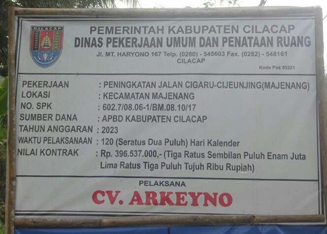 Cilacap || Hariansinarbogor.com – Yang mana pekerjaan tersebut dilaksanakan oleh CV. Arkeyno dengan Nilai Kontrak sebesar Rp.396.537.000 lama pekerjaaan 120 hari kalender. Yang dianggarkan melalui Dana APBD Kab. Cilacap2023.