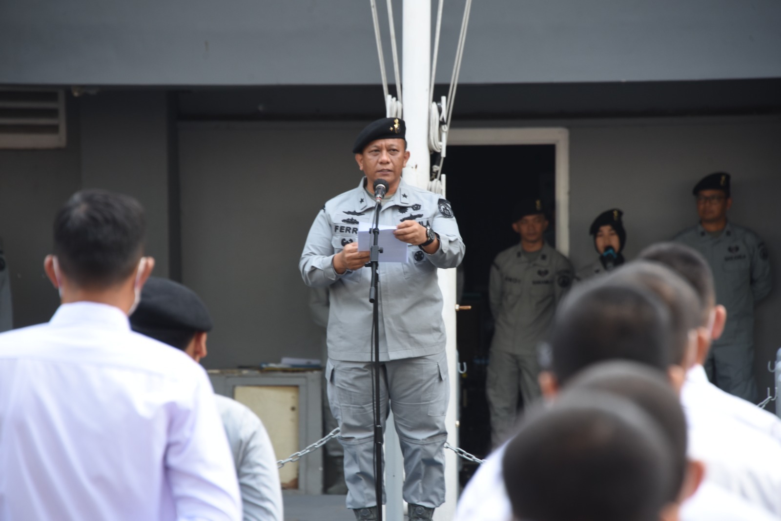 Sebanyak 62 personel P3K mendengarkan amanat Plh. Sekretaris Utama Bakamla RI Laksda Bakamla Samuel H. Kowaas, M.SC.,CSBA., yang dibacakan oleh Inspektur Upacara. Dalam sambutannya, beliau mengatakan kegiatan ini merupakan pengenalan awal bagi insan penjaga laut nusantara yang akan bergabung dengan Bakamla RI.