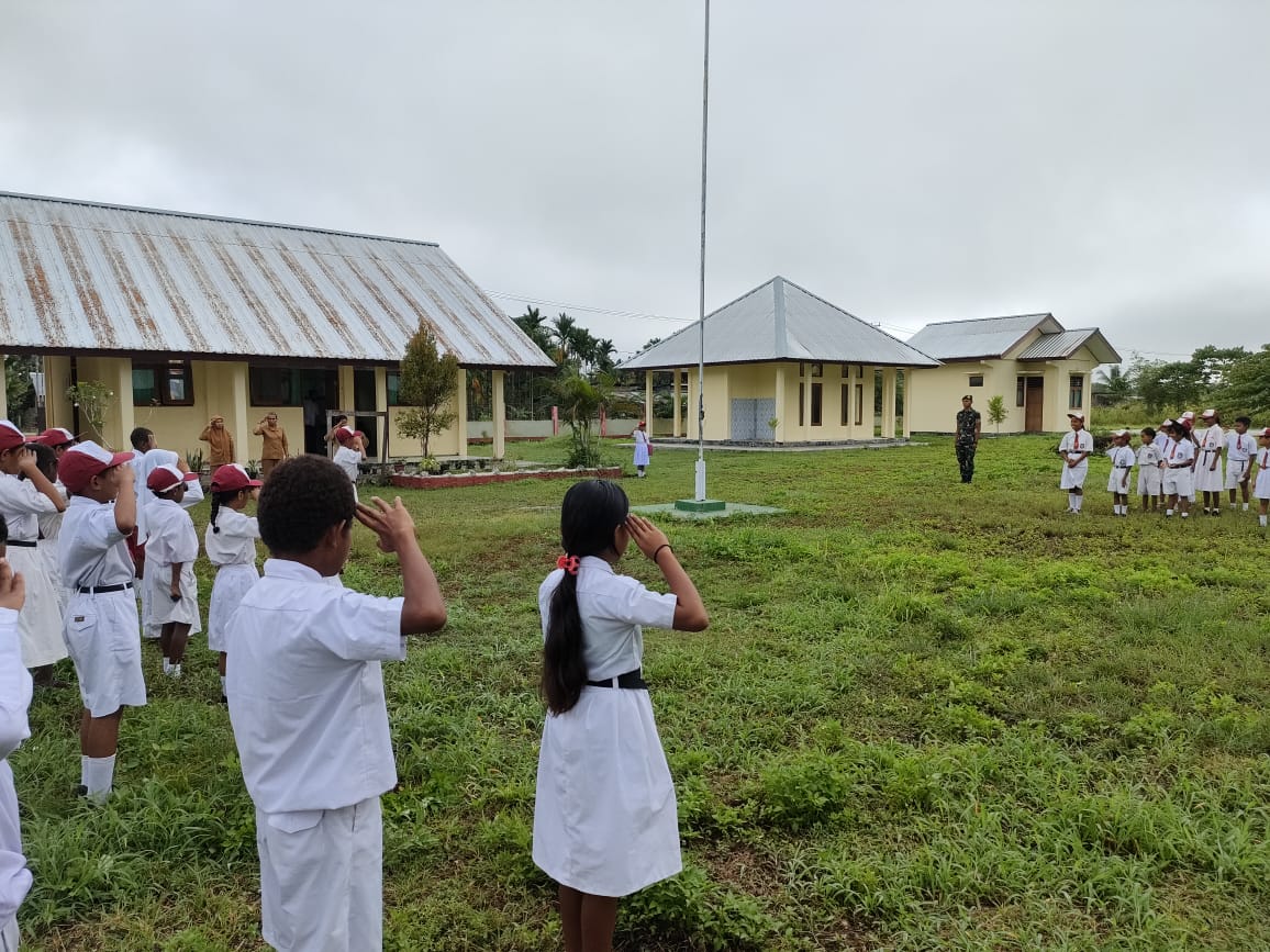 Tanamkan Kedisiplinan Dan Mental Kejuangan Satgas Yonif 122/TS Pos Pitewi Berikan Wawasan Kebangsaan Kepada Siswa-Siswi SDN Pitewi