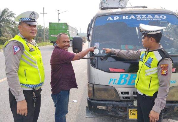 ROHIL (HSB) || Dalam melaksanakan Operasi Zebra Lancang Kuning 2023 hari ke 2, Satgas Preemtif Ops Zebra LK 2023 membagikan 50 Stiker kepada pengendara roda 2 dan roda 4 baik angkutan umum maupun barang.