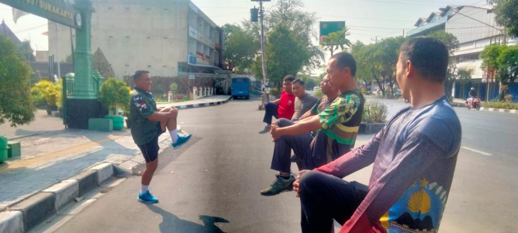 Sebelum pelaksanaan kegiatan terlebih dahulu dilaksanakan Apel Pagi yang dipimpin langsung oleh Kapten Cba Tri Rusman Prasetyo. S.Sos selaku Komandan Koramil 04/Jebres dan dilanjutkan dengan pemanasan agar otot-otot pada tubuh khususnya pada tangan dan kaki menjadi lebih lentur sehingga terhindar dari cedera otot serta menunjang kelancaran pada saat berjalan maupun gerakan olahraga lainnya.