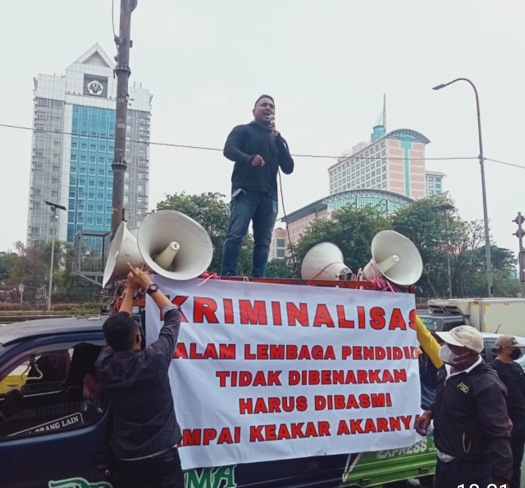 JAKARTA (HSB) | Lembaga Bantuan Hukum Ikatan Keluarga Besar Papua (LBH-IKBP) melakukan demonstrasi di depan Universitas Tarumanegara, Jalan S. Parman, Jakarta Barat, Senin (18/9/2023).