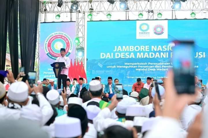 Cianjur (HSB) – Presiden Joko Widodo secara resmi membuka Jambore Nasional Dai Desa Madani Persaudaraan Muslimin Indonesia (Parmusi) Tahun 2023, yang diselenggarakan di Taman Nasional Gunung Gede Pangrango, Kabupaten Cianjur, Provinsi Jawa Barat, pada Selasa, 26 September 2023. Dalam sambutannya, Kepala Negara mengapresiasi program dai masuk desa yang menjadi prioritas Parmusi dalam mewujudkan Desa Madani.