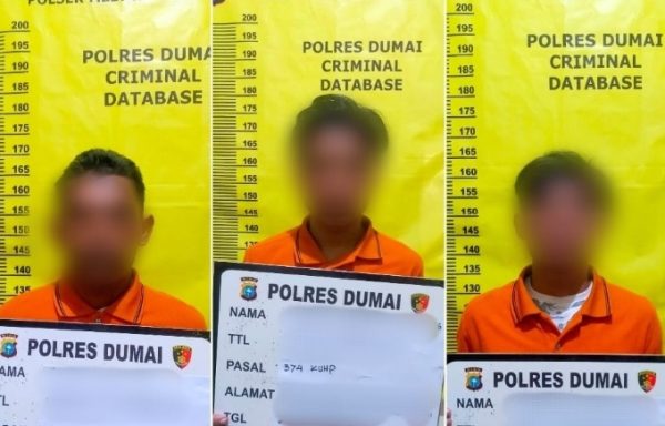 Kapolres Dumai AKBP Dhovan Oktavianton SH SIK MSi melalui Kapolsek Medang Kampai AKP Edwi Sunardi SAP SH mengatakan, pelaku tindak pidana penggelapan di PT Wicaksana Mas yang berhasil diamankan yakni GA alias GL (21) warga Kabupaten Serdang Bedagai Provinsi Sumatera Utara selaku Mandor, AY alias YR (21) warga Kabupaten Batu Bara Provinsi Sumatera Utara selaku Teknisi Perancah dan SS alias SN (41) warga Kecamatan Medang Kampai selaku penadah barang hasil penggelapan.