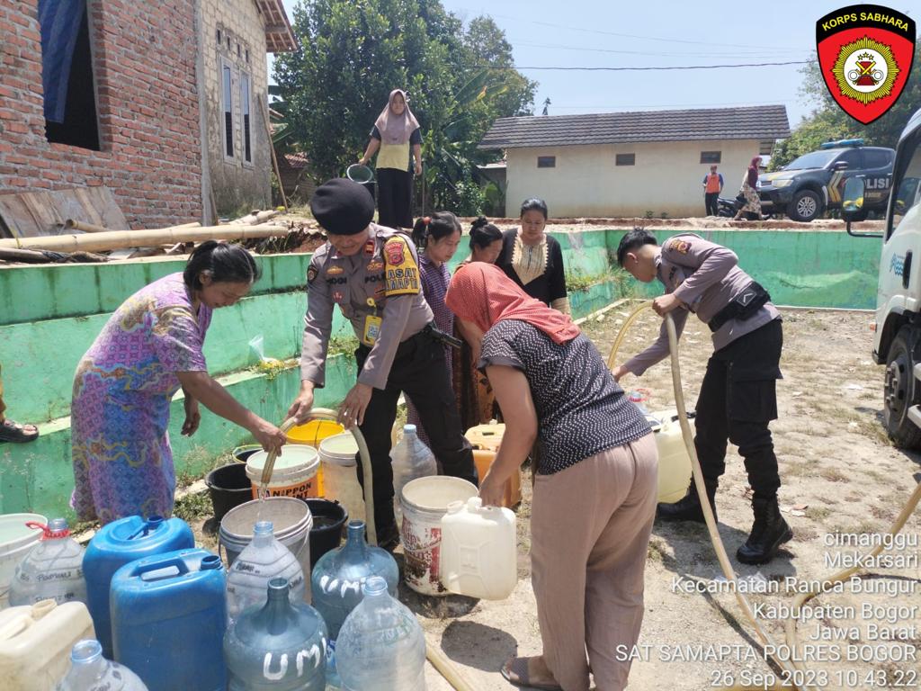 Polres Bogor (HSB) – Satuan Samapta (Sat Samapta) bekerja sama dengan PDAM Kabupaten Bogor terus berikan bantuan air bersih kepada masyarakat di Kampung Cimanggu, Desa Mekarsari, Kecamatan Rancabungur Kabupaten Bogor. Pada Selasa, tanggal 26 September 2023,