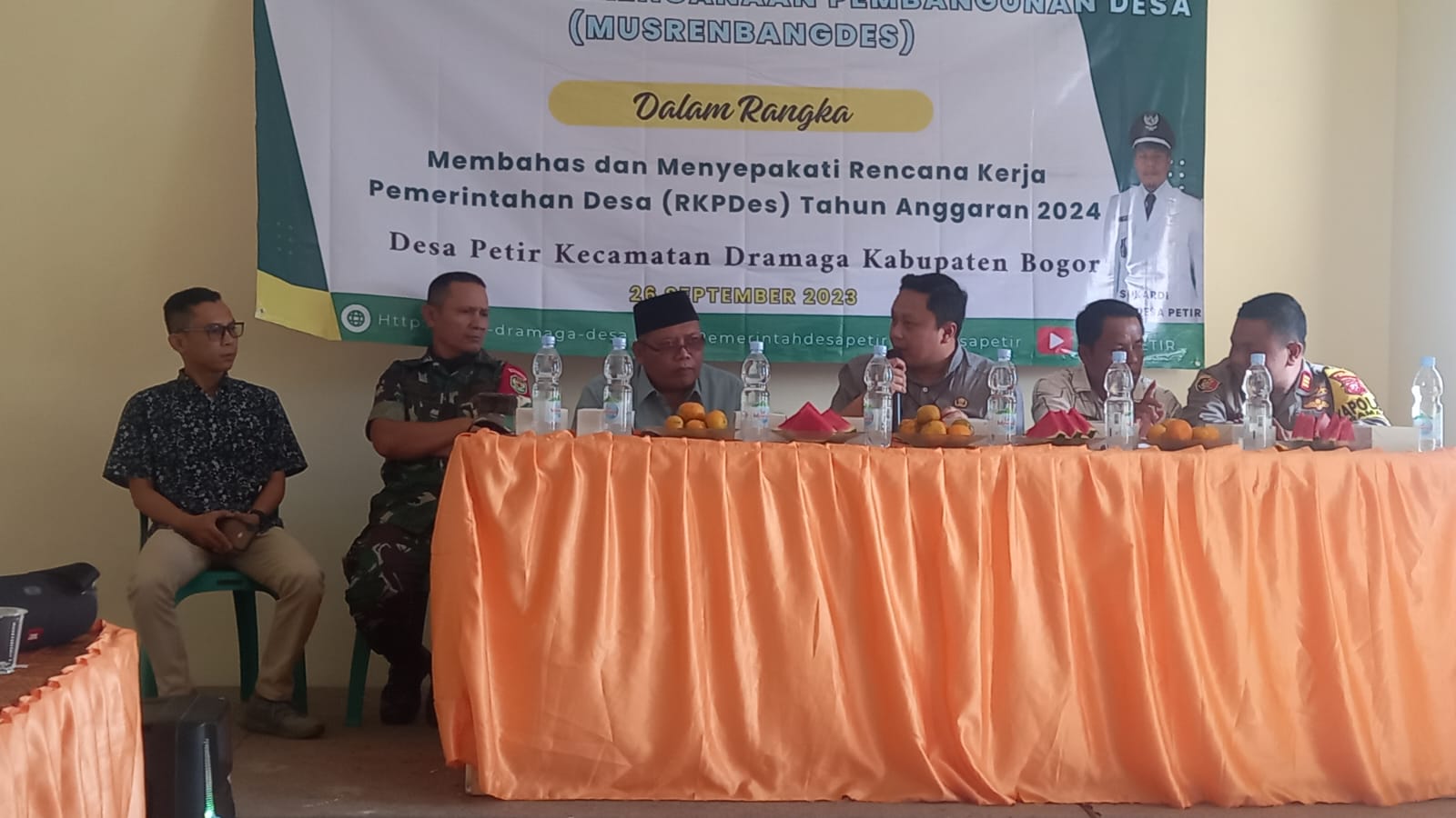 Polres Bogor (HSB) – Polsek Dramaga Polres Bogor Polda Jabar, Kapolsek Dramaga Polres Bogor Polda Jawa Barat AKP Budi Sehabudin,.S.H,.M.H menghadiri kegiatan Musyawarah Perencanaan Pembangunan Desa (MUSRENBANGDES) dalam Rangka Pembahasan Perencanaan Rencana Kerja Pemerintah Desa ( RKPDes ) TA. 2024 dan Daftar Usulan RKP Desa Tahun 2025 Desa Petir Kecamatan Dramaga Kabupaten Bogor yang diselenggarakan di Aula Serba Guna Kantor Desa Petir, (27/09/2023).