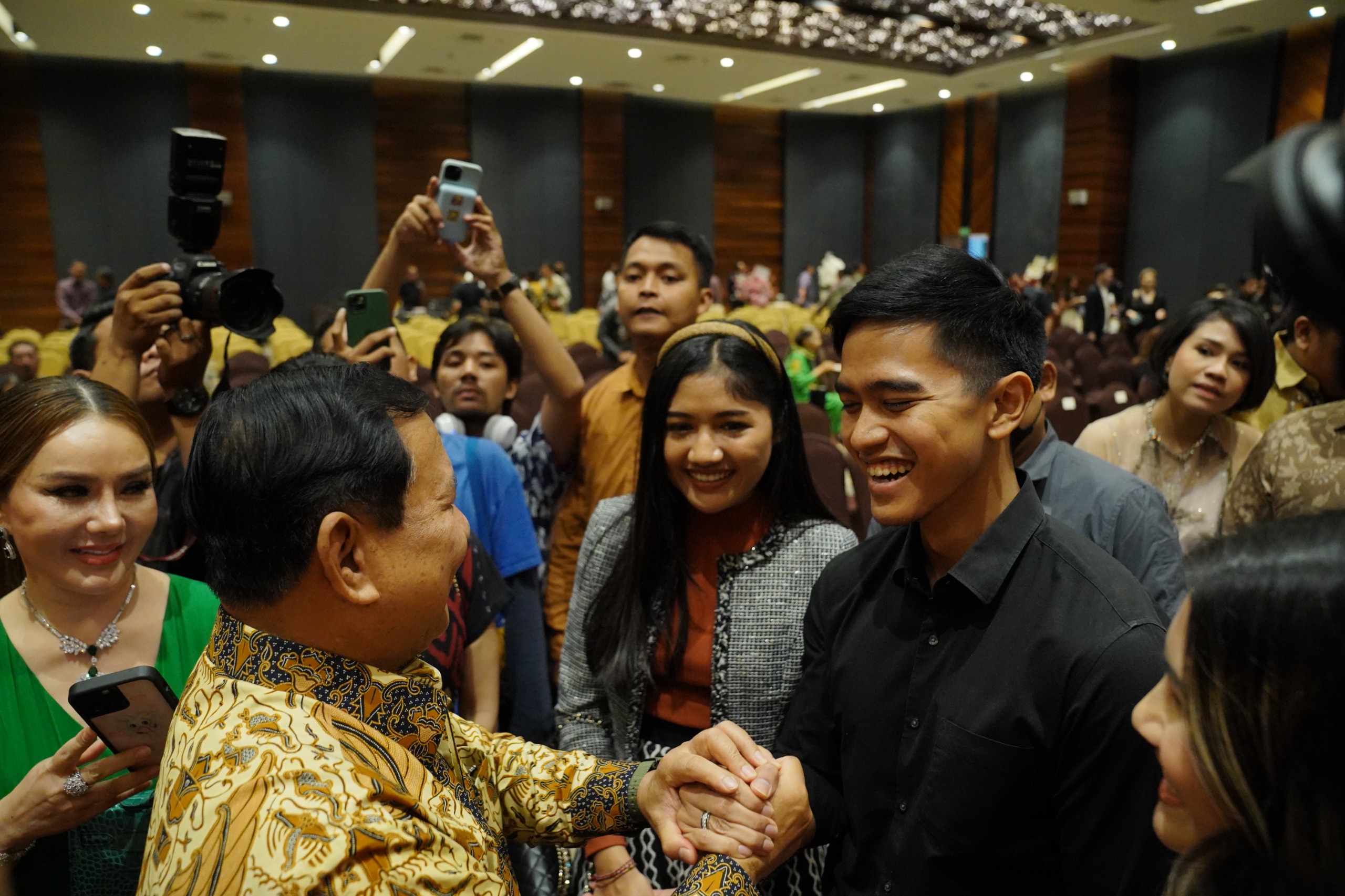 Prabowo bersama dengan Kaesang yang didampingi sang istri Erina nampak bercengkrama sembari berbincang santai dengan Grace Natalie Wakil Ketua Dewan PSI, Isyana Bagoes Oka Plt Sekjen PSI dan Cheryl Tanzil Ketua DPP PSI.