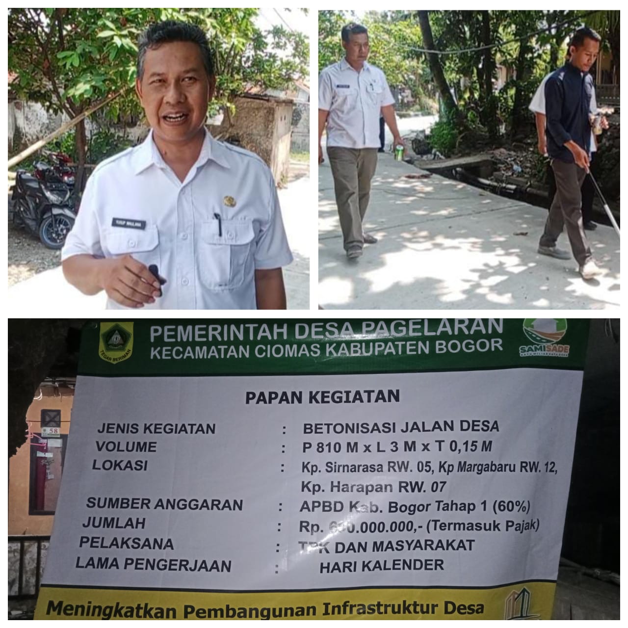kedatangan team kecamatan ciomas serta konsultan melakukan monev dari program samisade dengan pengerjaan betonisasi jalan desa di wilayah kampung sirnarasa RW 05 kampung margabaru RW 12 dan kampung harapan RW 07, volume panjang P. 810 M. X L 3 M. X T. O,15 M,” sumber dana APBD KABUPATEN bogor tahap awal dengan jumlah 600 juta dengan pelaksana TPK dan masyarakat.