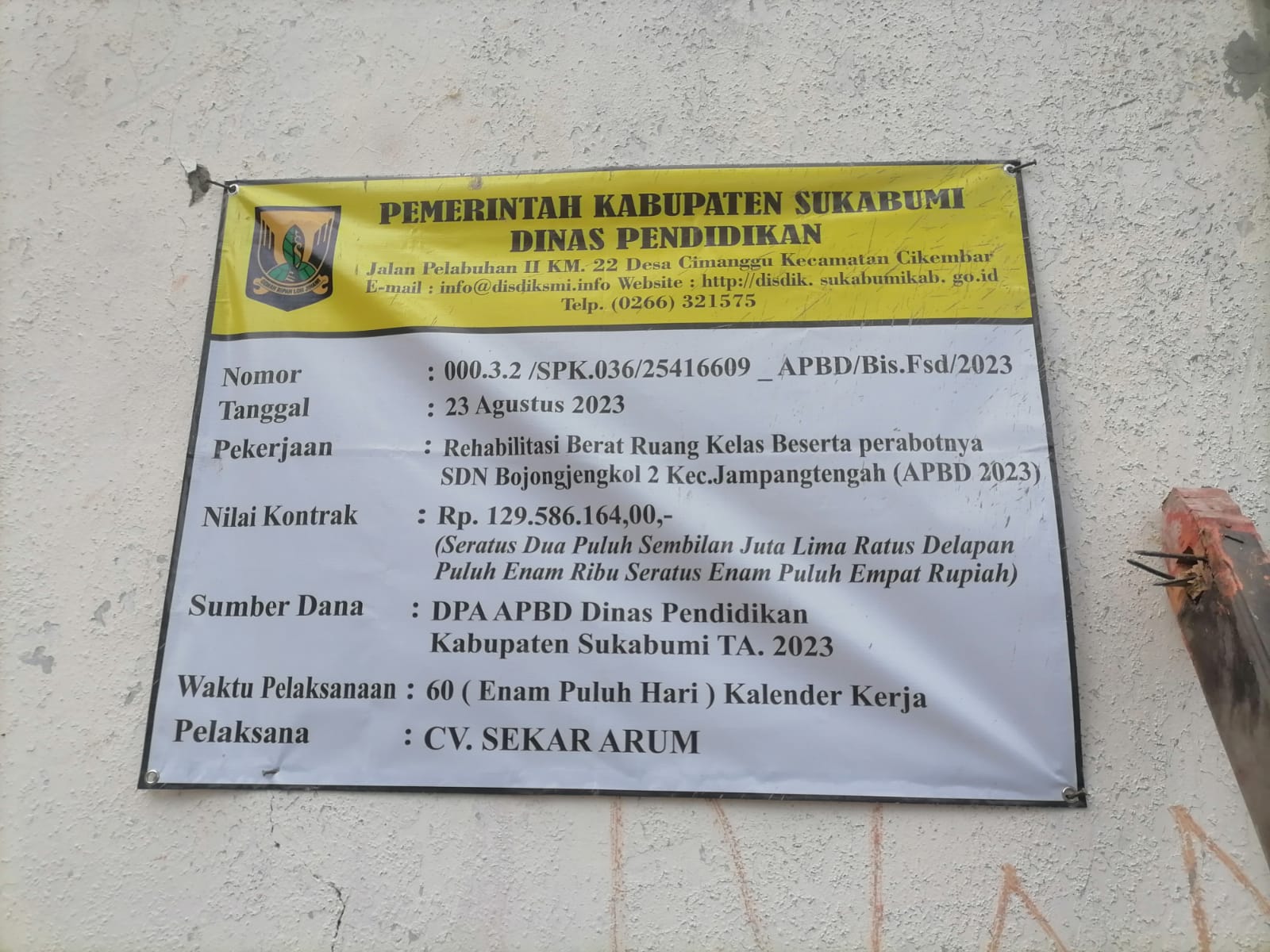 SDN Bojong jengkol 2 Desa Bojong jengkol Kecamatan Jampang Tengah CV sekar arum sebagai pemenang Tender untuk Rehabilitasi Ruang kelas Beserta Perabotannya.