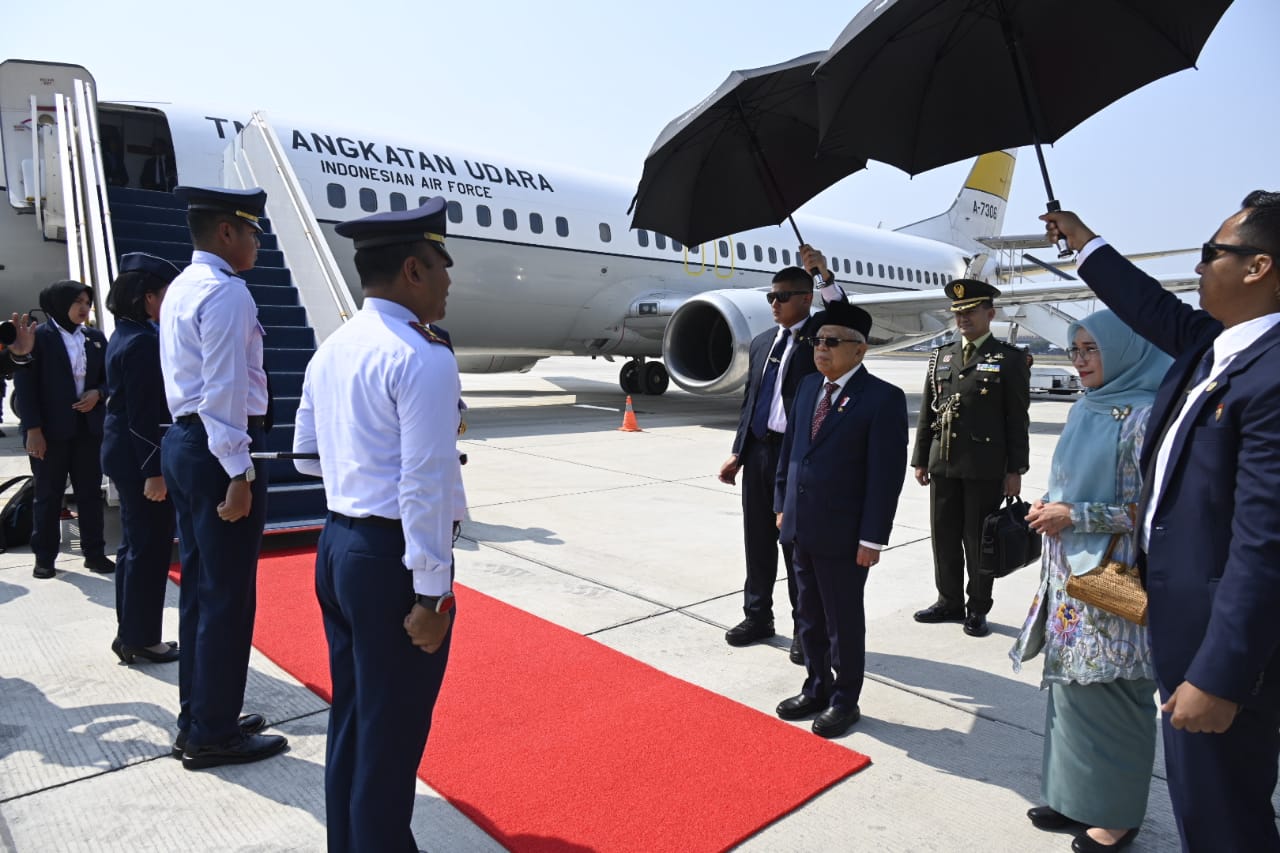 Jakarta | HSB – Usai melepas keberangkatan kunjungan kerja Presiden Joko Widodo beserta Ibu Negara Iriana ke luar negeri, Wakil Presiden (Wapres) K.H. Ma’ruf Amin dari Bandara Internasional Soekarno Hatta Tangerang, Banten langsung beranjak ke Pangkalan TNI AU Halim Perdanakusuma, Jakarta untuk bertolak ke Provinsi Bali, Senin pagi (16/10/2023). Adapun salah satu tujuan utama Wapres terbang ke Bali adalah untuk menghadiri Sesi Tahunan ke-61 Asian-African Legal Consultative Organization (AALCO).