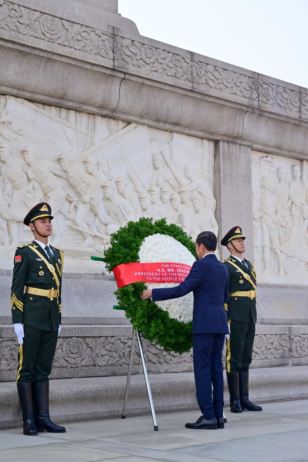 Beijing (HSB) – Presiden Joko Widodo mengunjungi Monumen Pahlawan Rakyat, Tiananmen Square di Beijing, Republik Rakyat Tiongkok (RRT) pada Selasa, 17 Oktober 2023 untuk melakukan peletakan karangan bunga atau _flower tribute_. Kegiatan tersebut merupakan bagian dari kunjungan Presiden Jokowi ke RRT.