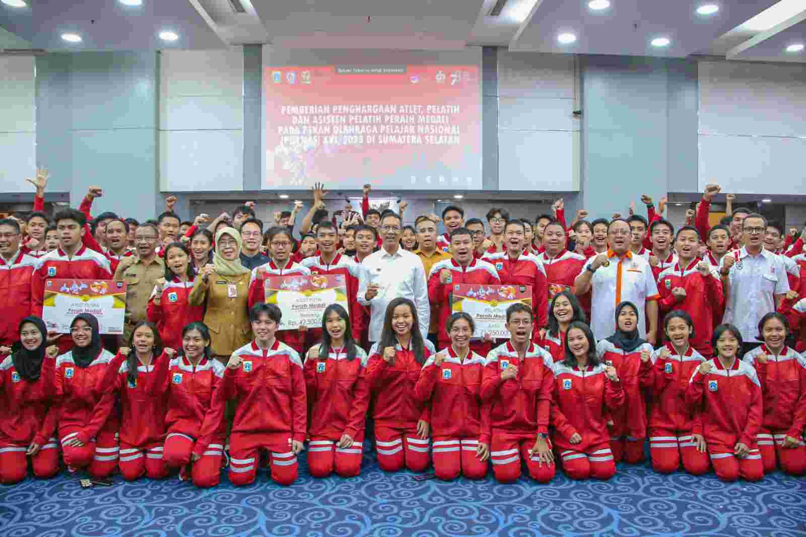 Jakarta (HSB) – Penjabat Gubernur DKI Jakarta, Heru Budi Hartono memberikan apresiasi kepada seluruh kontingen DKI Jakarta, yang telah meraih juara umum Pekan Olahraga Pelajar Nasional di Ruang Pola, Balai Kota, Jakarta, Selasa (17/10/2023).