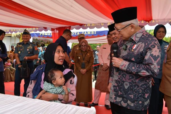 JAMBI (HSB) – Wakil Presiden KH Ma’ruf Amin beserta Ibu Hj Wury Ma’ruf Amin meninjau Posyandu Dahlia I, Kelurahan Thehok, Kecamatan Jambi Selatan, Selasa (31/10/2024).
