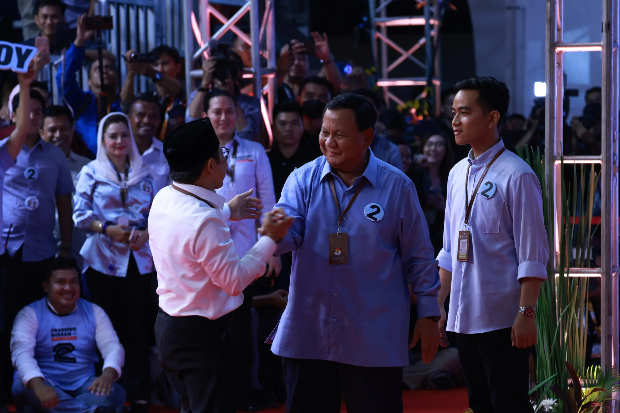 Mereka lalu saling melakukan tos tangan dan bersalaman. Prabowo juga nampak berjoget dan Gibran bertepuk tangan seraya kembali ke tempat duduknya.