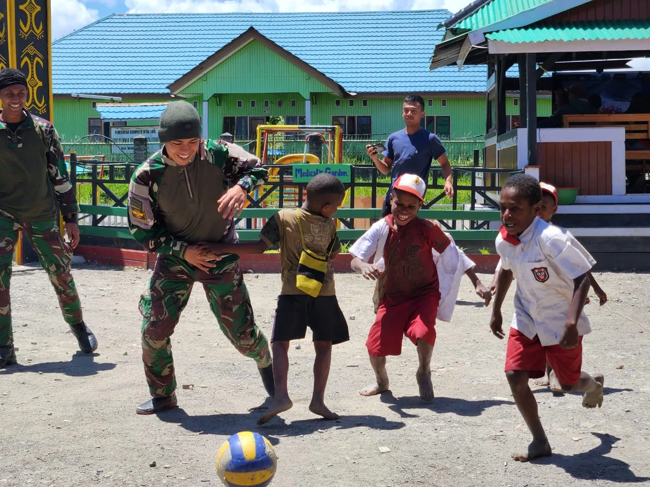 Potret keceriaan anak-anak Intan Jaya saat bermain bola bersama prajurit Tri Dharma menunjukkan eratnya hubungan kekeluargaan yang terjalin antara prajurit Satgas 330 dengan masyarakat di wilayah penugasan.(Red)