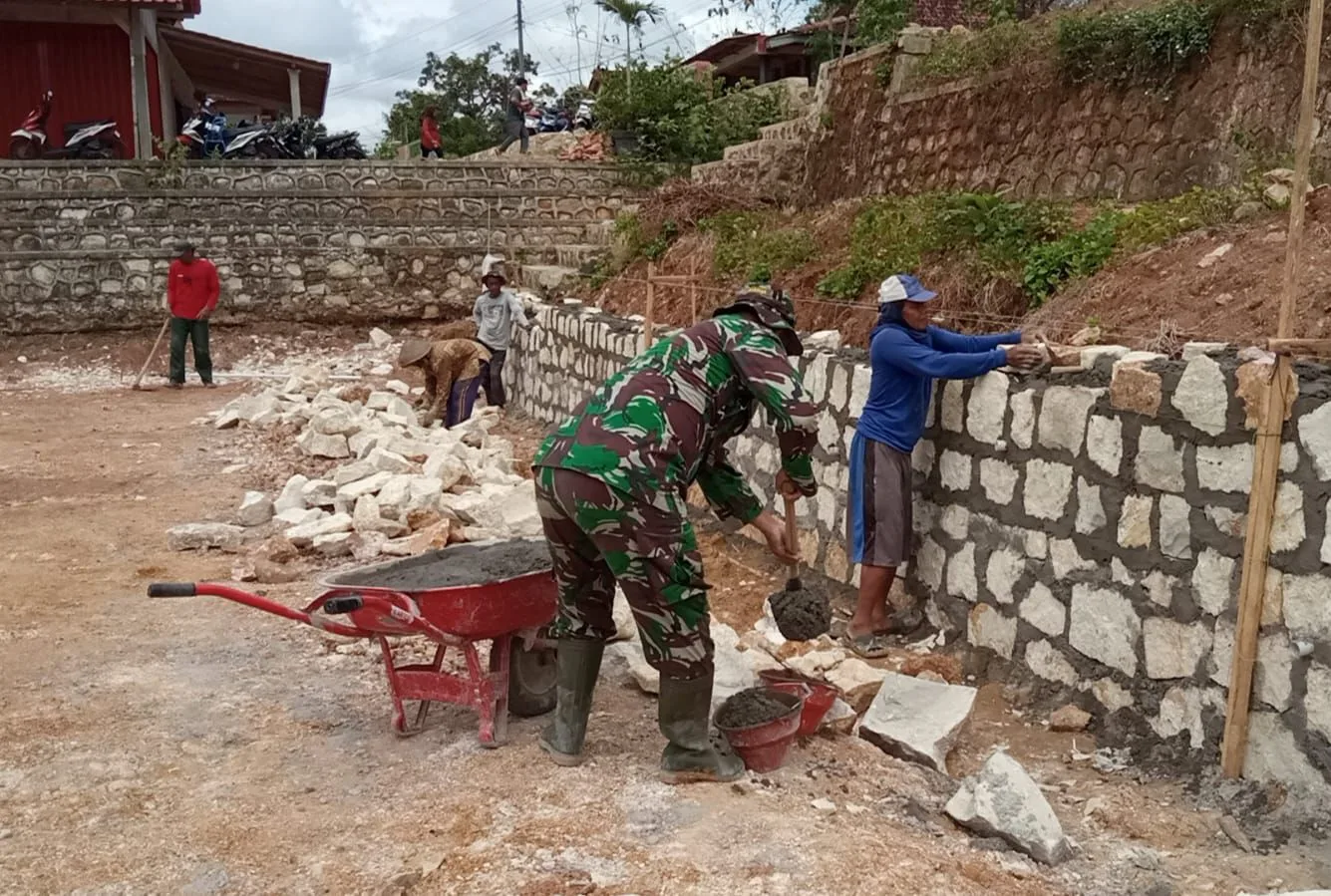Wonogiri – Kebersamaan dan kedekatan Babinsa bersama masyarakat diwilayah binaan, ditunjukkan oleh Babinsa Desa Tukulrejo, Koramil 08/Giriwoyo Serka Bejo Sariyono, dengan turut melaksanakan kerja bakti pembuatan talud di Lapangan Sepak Bola Dusun Kajang RT 01/03, Desa Tukulrejo, Selasa(21/11/2023).