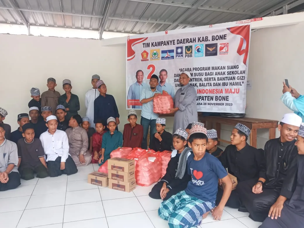Bone – 28 November 2023, Hari pertama masa kampanye Pemilu 2024 di Kabupaten Bone, Tim Kampanye Daerah (TKD) Pasangan Capres-Cawapres Prabowo-Gibran memulai aksi dengan berbagi makanan dan susu gratis di Pesantren Darul Lappae, Kecamatan Tellu Siattinge, Kabupaten Bone.