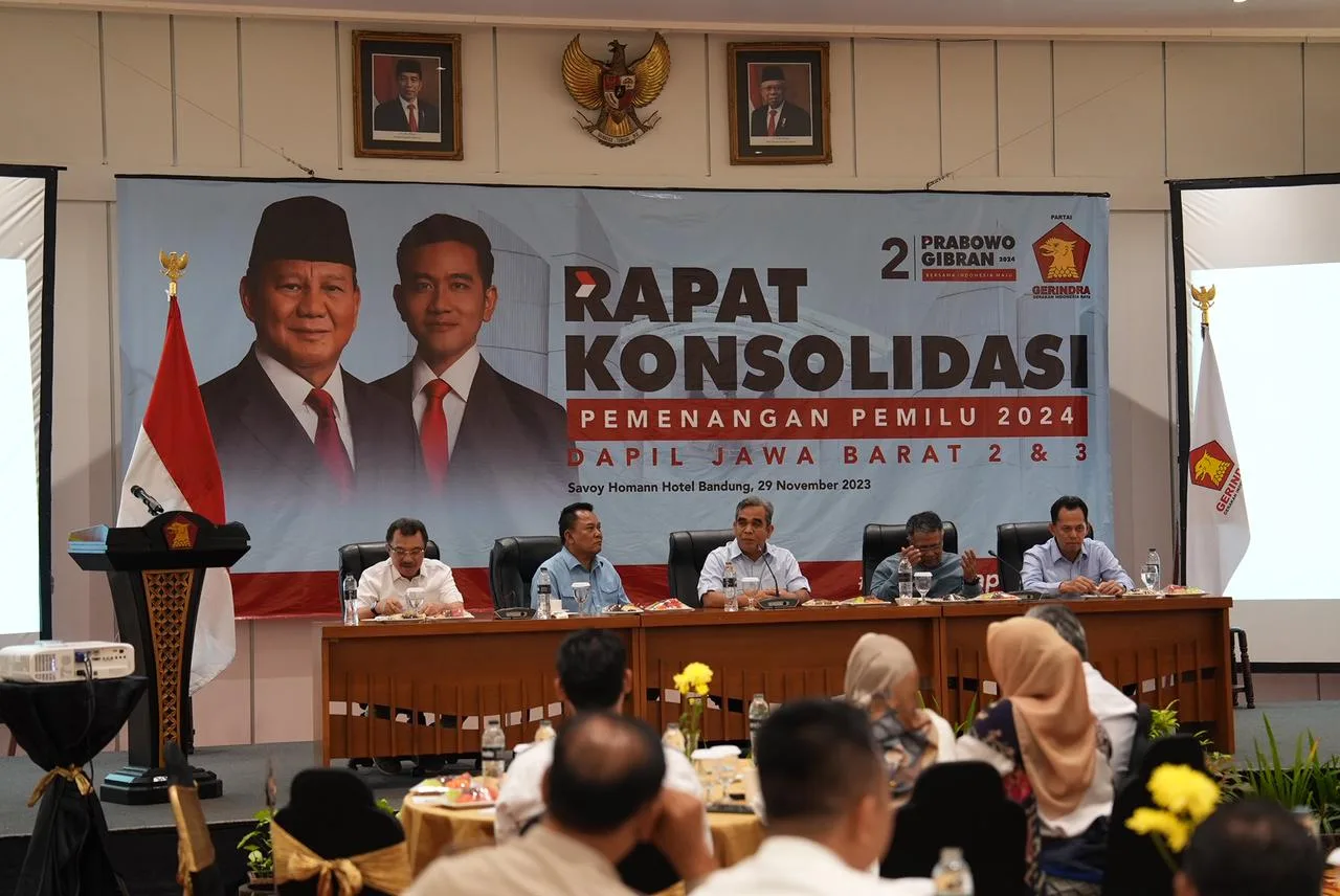 Bandung – Sekjen Partai Gerindra Ahmad Muzani menghadiri rapat konsolidasi bersama kader Gerindra dapil Jawa Barat I (Kota Bandung, Kota Cimahi) dan II (Kabupaten Bandung, Kabupaten Bandung Barat), Rabu (29/11).