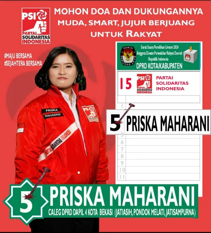 Kota Bekasi – Priska Maharani adalah sosok yang selama ini dikenal sebagai Seorang tenaga Pendidik. 2024 yang akan datang Priska Maharani akan maju menjadi Calon anggota legislatif untuk DPRD Kota Bekasi Dapil kota Bekasi IV Nomer Urut 5 (Lima) dari Partai Solidaritas Indonesia (PSI)