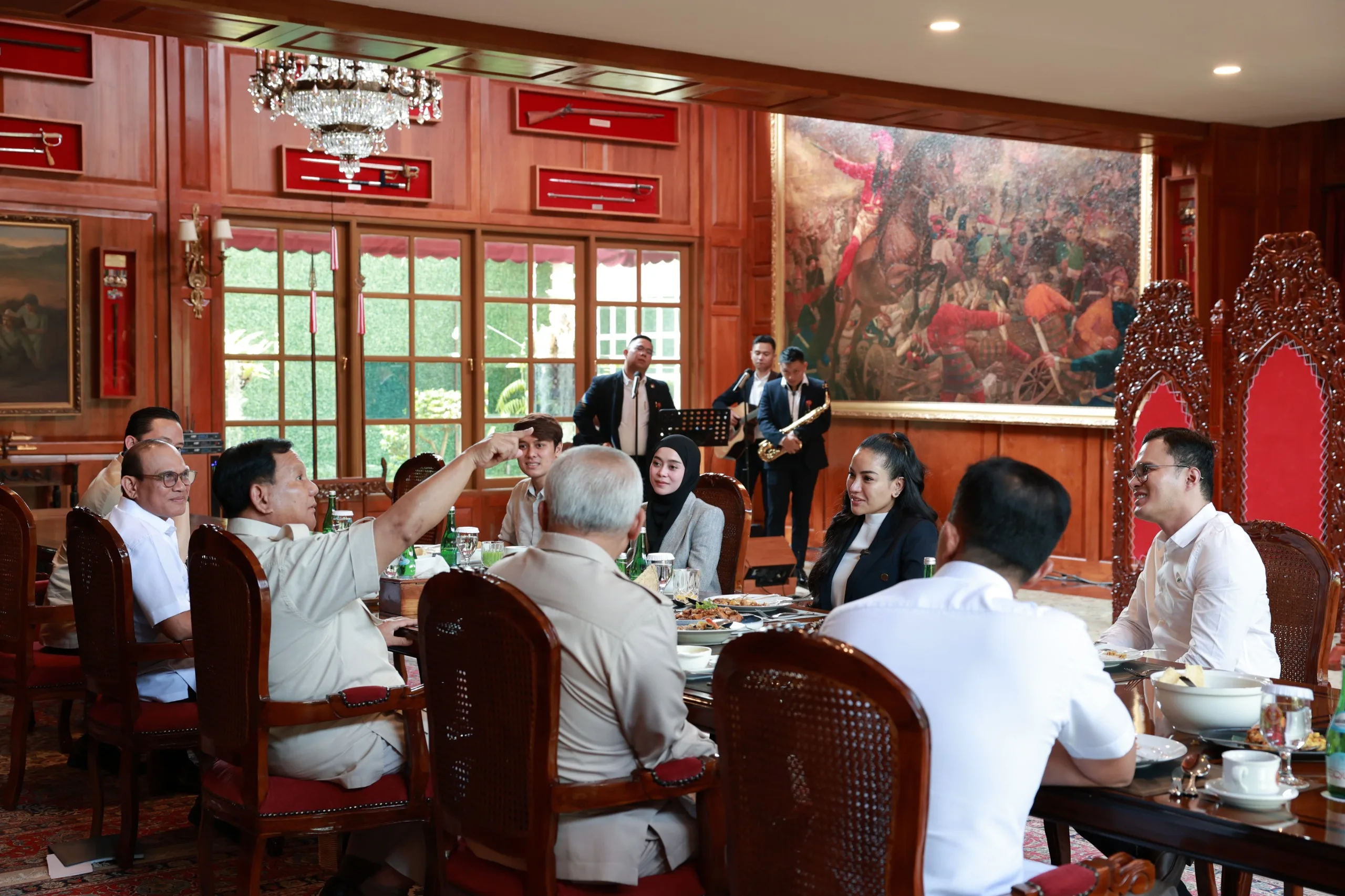 Prabowo kemudian mengundang para tamunya untuk makan siang bersama. Mereka nampak akrab, saling berbincang dan bergurau satu sama lain.