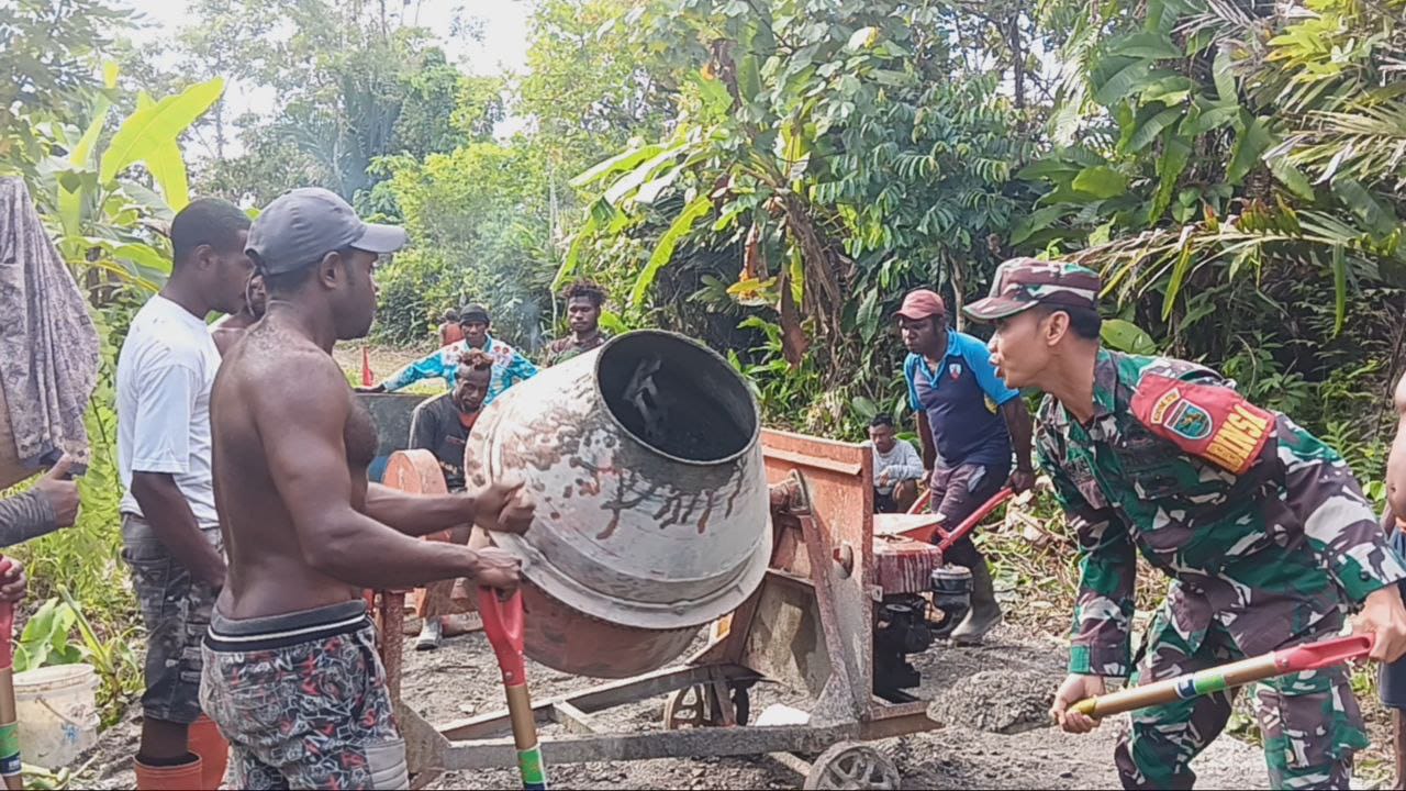 Timika – Dalam rangka menjalin kebersamaan serta memperkokoh kemanunggalan TNI bersama Rakyat, Babinsa Koramil 1710-07/Mapurujaya Sertu Tangkas Budiono dan Koptu Redemtus Riyanto melaksanakan kerja bakti pengecoran jalan di Kelurahan Wania, Distrik Mimika Timur, Kab. Mimika, Sabtu (09/12/2023).