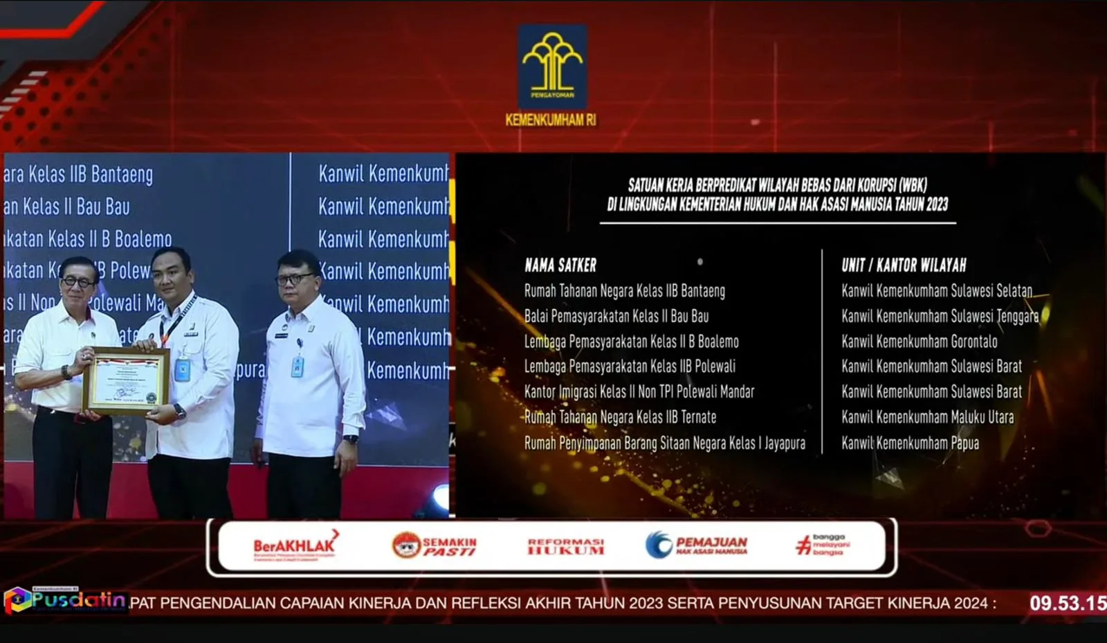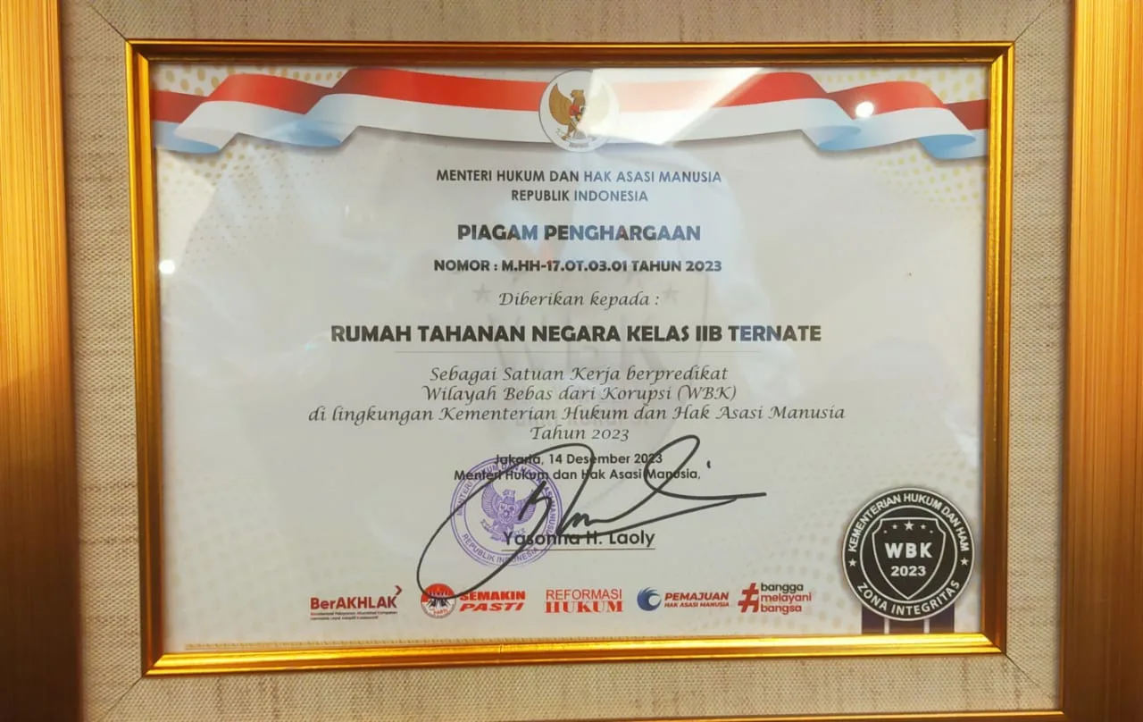 “Kami menerima langsung Penghargaan tentang Penetapan Satuan Kerja Berpredikat Wilayah Bebas Korupsi (WBK) Kemenkumham Tahun 2023.” Kepala Rutan Kelas IIB Ternate , Yudhi Khairudin.