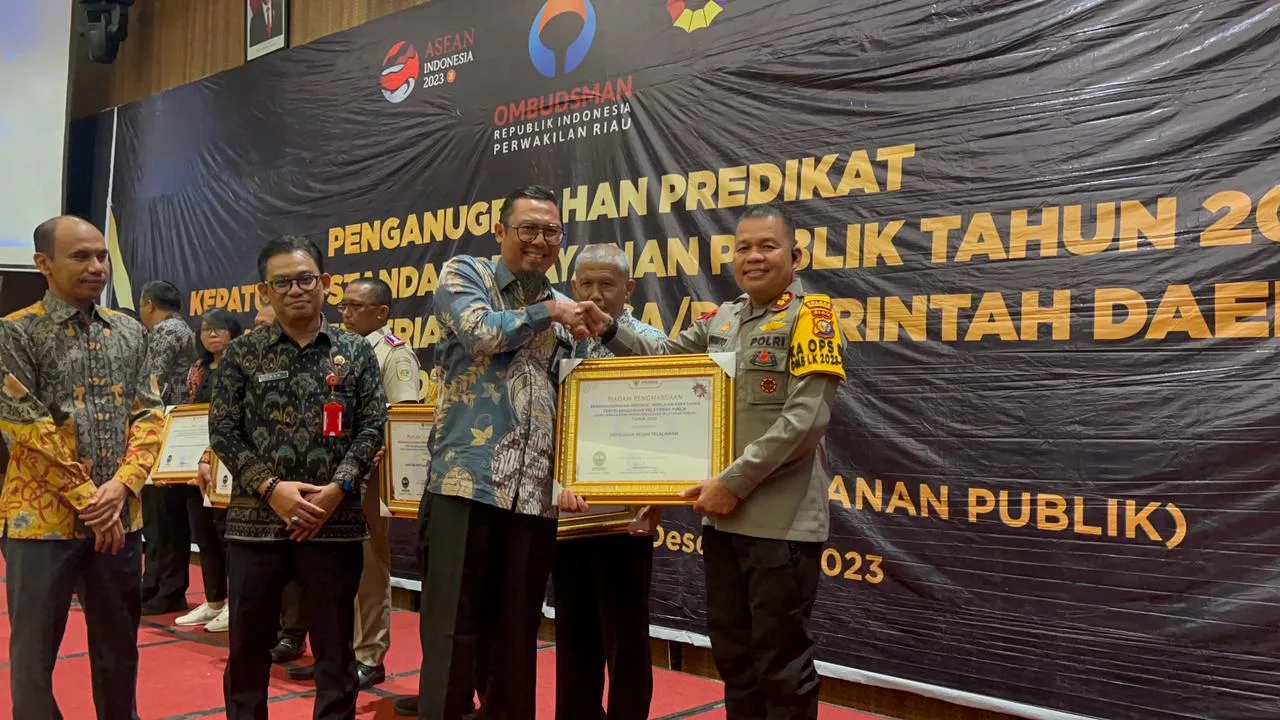 Kapolres Pelalawan Terima Penghargaan Penganugerahan Predikat Kepatuhan Standar Pelayanan Publik Tahun 2023 dari Ombudsmen RI