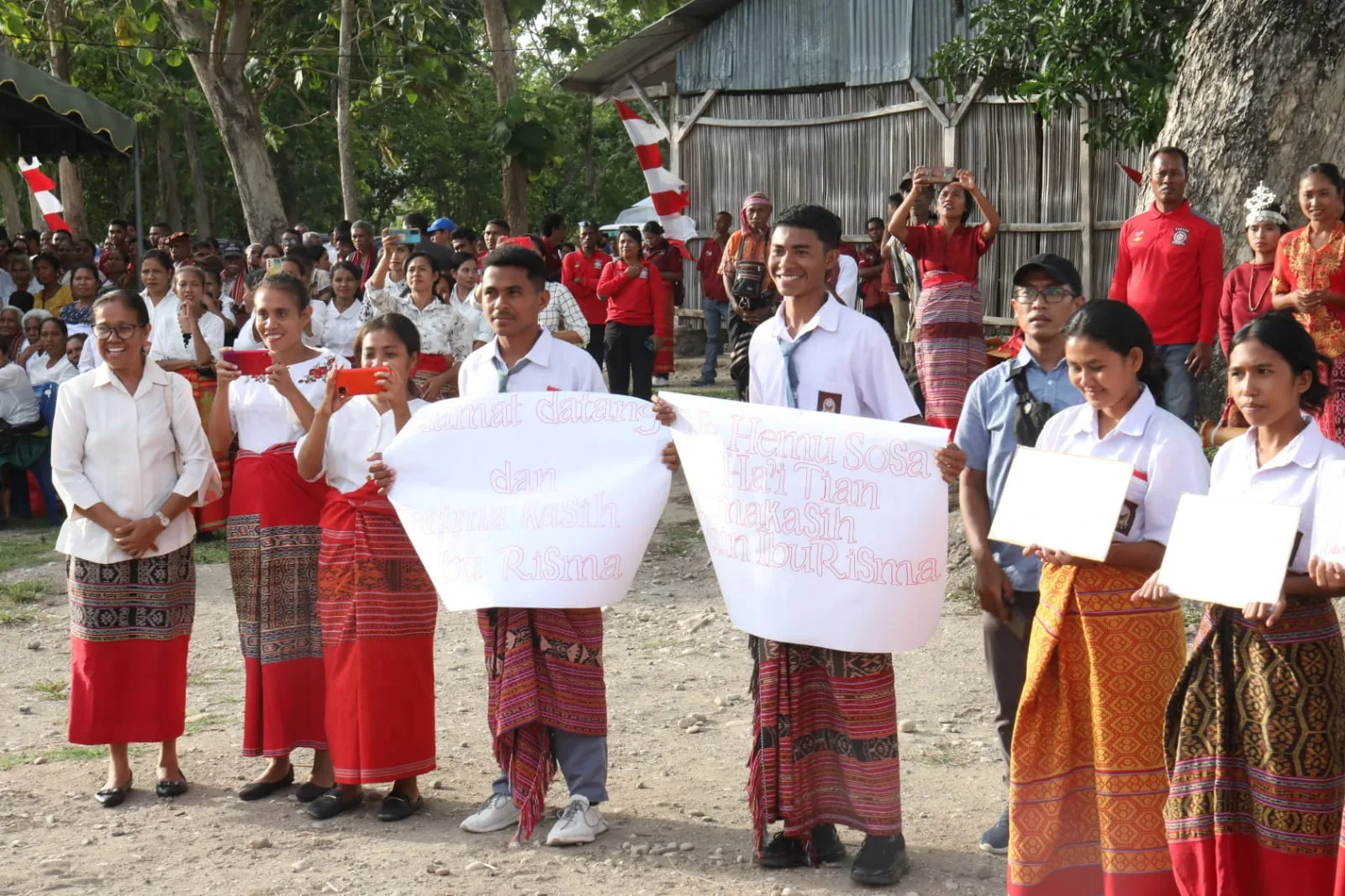 Karton berwarna merah itu dibentangkan siswa SMA Plus St. Albertus, Desa Bakiruk, Kecamatan Malaka Tengah, Kabupaten Malaka, Nusa Tenggara Timur saat kunjungan Menteri Sosial Tri Rismaharini, Senin 18 Desember 2023.