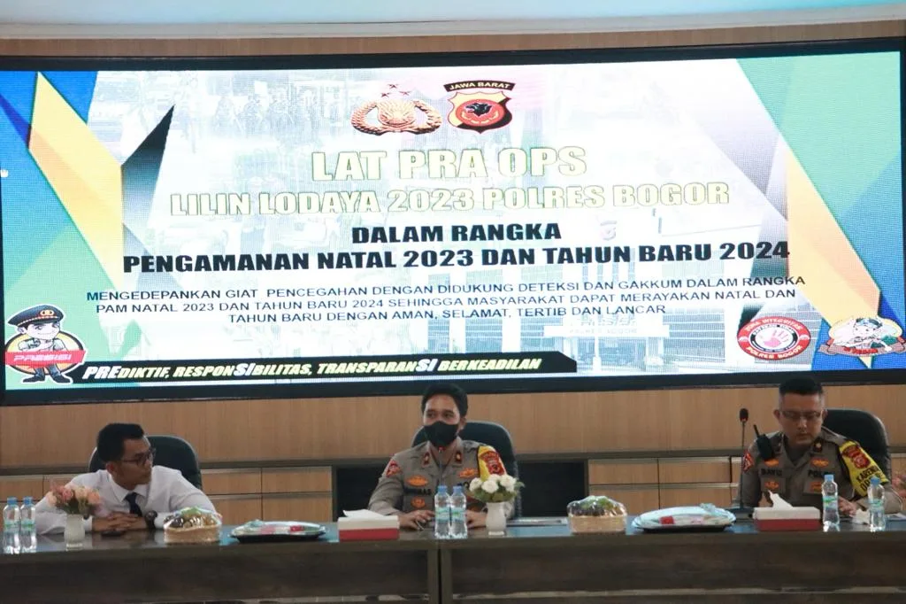 Polres Bogor – Melakukan Kegiatan Lat Pra Ops Lodaya 2023 Dalam Rangka pengamanan Natal 2023 dan Tahun Baru 2023 Yang bertempat di aula Sanika Satyawada Kamis 21 Desember 2023, mulai pukul 09.00 WIB sd 09.40 yang dipimpin oleh Wakapolres Bogor Kompol Adhimas Sriyono Putra S.I.K. M.M didampingi Kabag Ops Polres Bogor, Kompol Bayu Tri Nugraha, S.E,S.I.K,M.M dan Kasat Intelkam Polres Bogor AKP Ari Nugroho, S.I.K., M.Si