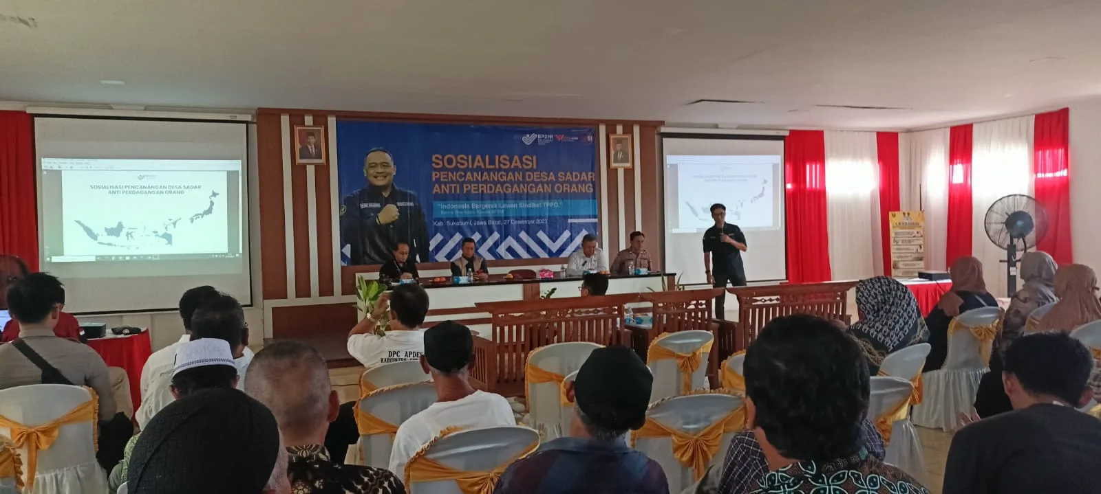 SUKABUMI – Forum Diskusi Sinergi Indonesia (FDSI) bersama Badan Perlindungan Pekerja Migran Indonesia (BP2MI) dan Wartain.com terus fokus memotong rantai mafia tindak pidana perdagangan orang (TPPO). Mereka menggelar Sosialisasi Pencanangan Desa Sadar Anti Perdagangan Orang di Kabupaten Sukabumi di Aula Kecamatan Cikembar, Kabupaten Sukabumi, Rabu (27/12/2023).