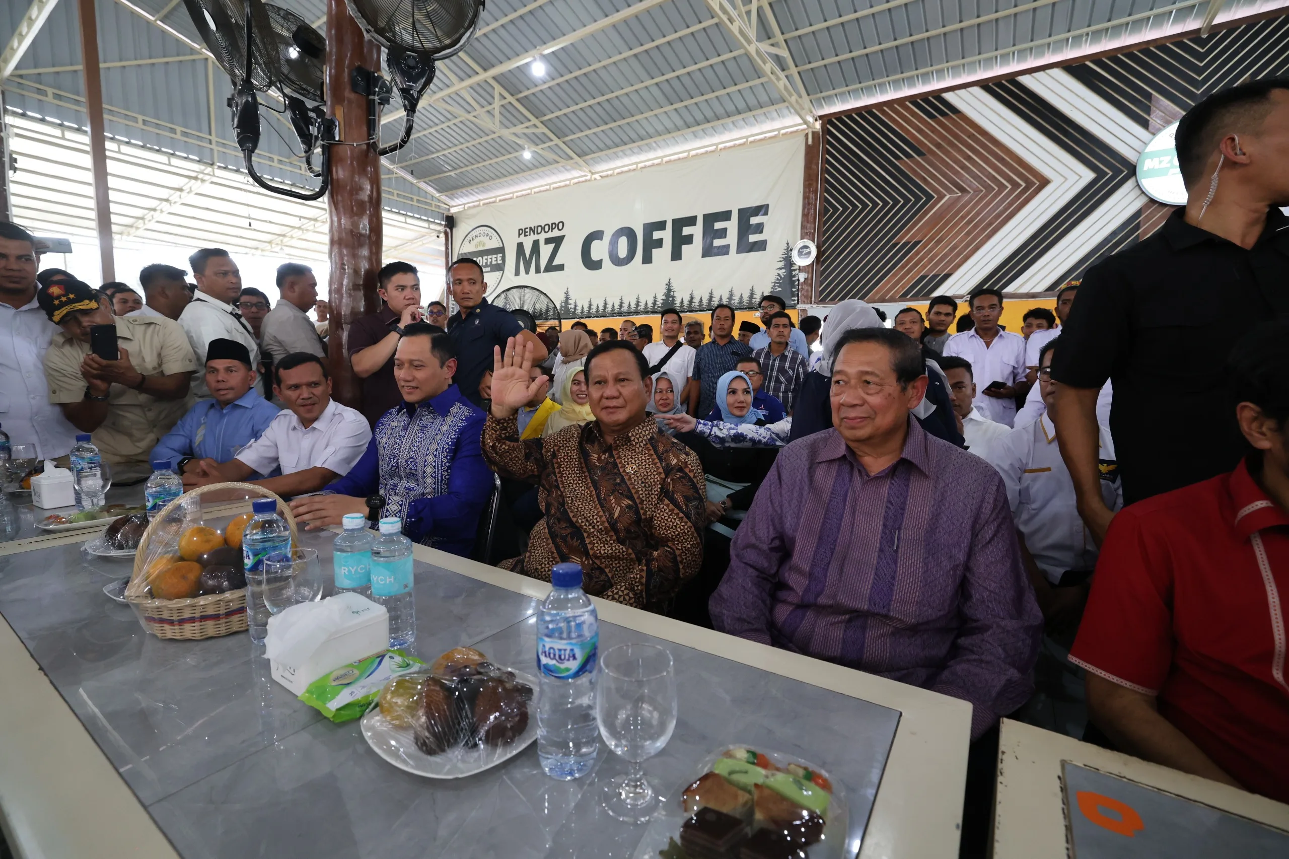 Banda Aceh – Calon Presiden nomor urut 2, Prabowo Subianto menikmati secangkir kopi khas Aceh bersama dengan Presiden ke-6 Susilo Bambang Yudhoyono dan juga Ketua Umum Partai Demokrat Agus Harimurti Yudhoyono di Kedai MZ Coffee, Banda Aceh, Selasa (26/12/2023) bersama warga dan para relawan.