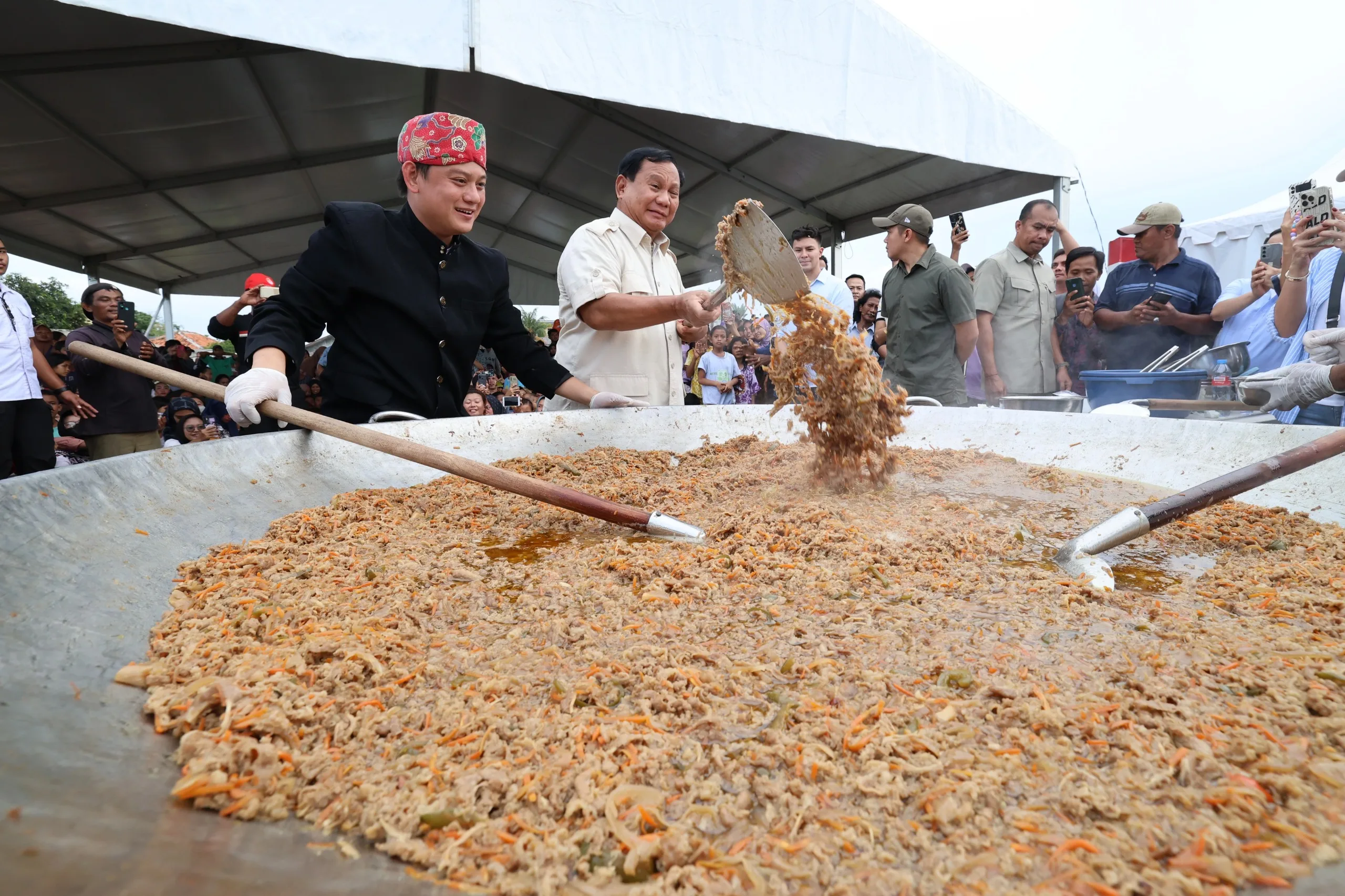 Dalam momen tersebut, Prabowo juga ikut menabur bawang goreng di atas potongan daging sapi bumbu teriyaki yang sedang dimasak di kuali superbesar. Ia ikut mengaduk, kemudian menyicipi masakan yang akan dibagikan kepada warga.
