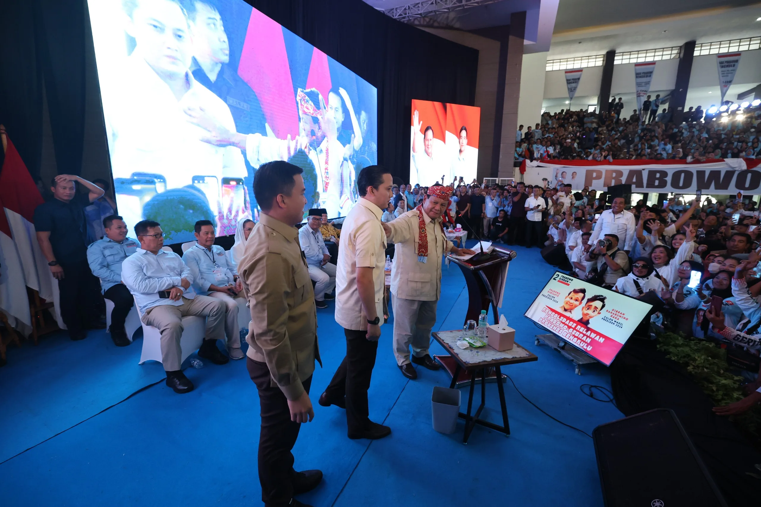 Bengkulu – Calon presiden nomor urut 2, Prabowo Subianto menghadiri acara ‘Konsolidasi Relawan Prabowo-Gibran Provinsi Bengkulu’ yang digelar di Balai Buntar, Bengkulu, Kamis (11/1).