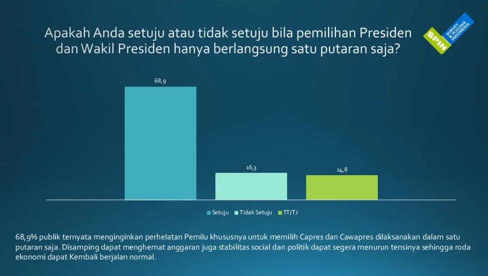 “Bila pemilu berlangsung dua putaran dan yang lolos Prabowo-Gibran vs Ganjar Mahfud, yang akan keluar sebagai pemenang adalah pasangan calon Prabowo-Gibran dengan perolehan suara 78,3% sementara Ganjar-Mahfud 16,7%,” ungkap Igor Dirgantara Direktur Eksekutif SPIN.