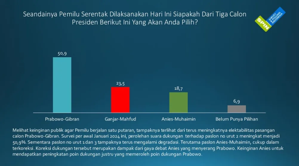 Survei SPIN Pascadebat Ketiga: Elektabilitas Prabowo-Gibran Tertinggi Capai 50,9%, Potensi Satu Putaran