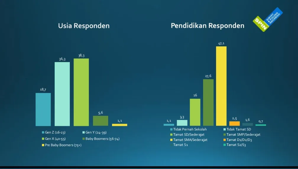 Direktur eksekutif Survei and Polling Indonesia (SPIN), Igor Dirgantara memaparkan Prabowo-Gibran unggul di kategori pemilih muda. Mereka meraih angka dukungan rata-rata 50% pada Gen Z, Gen Y atau milenial dan Gen X.