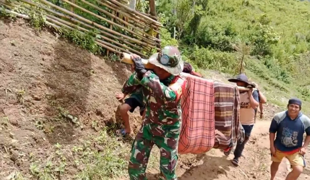 Babinsa Koramil 1404-04/Malunda Bantu Evakuasi Warga Dengan Ditandu Sejauh 10 Km