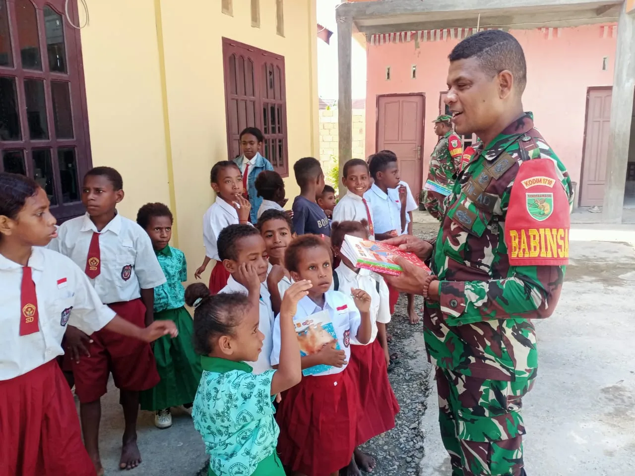 Babinsa Timika Bagikan Buku Tulis ke Siswa SD Teologi Kristen
