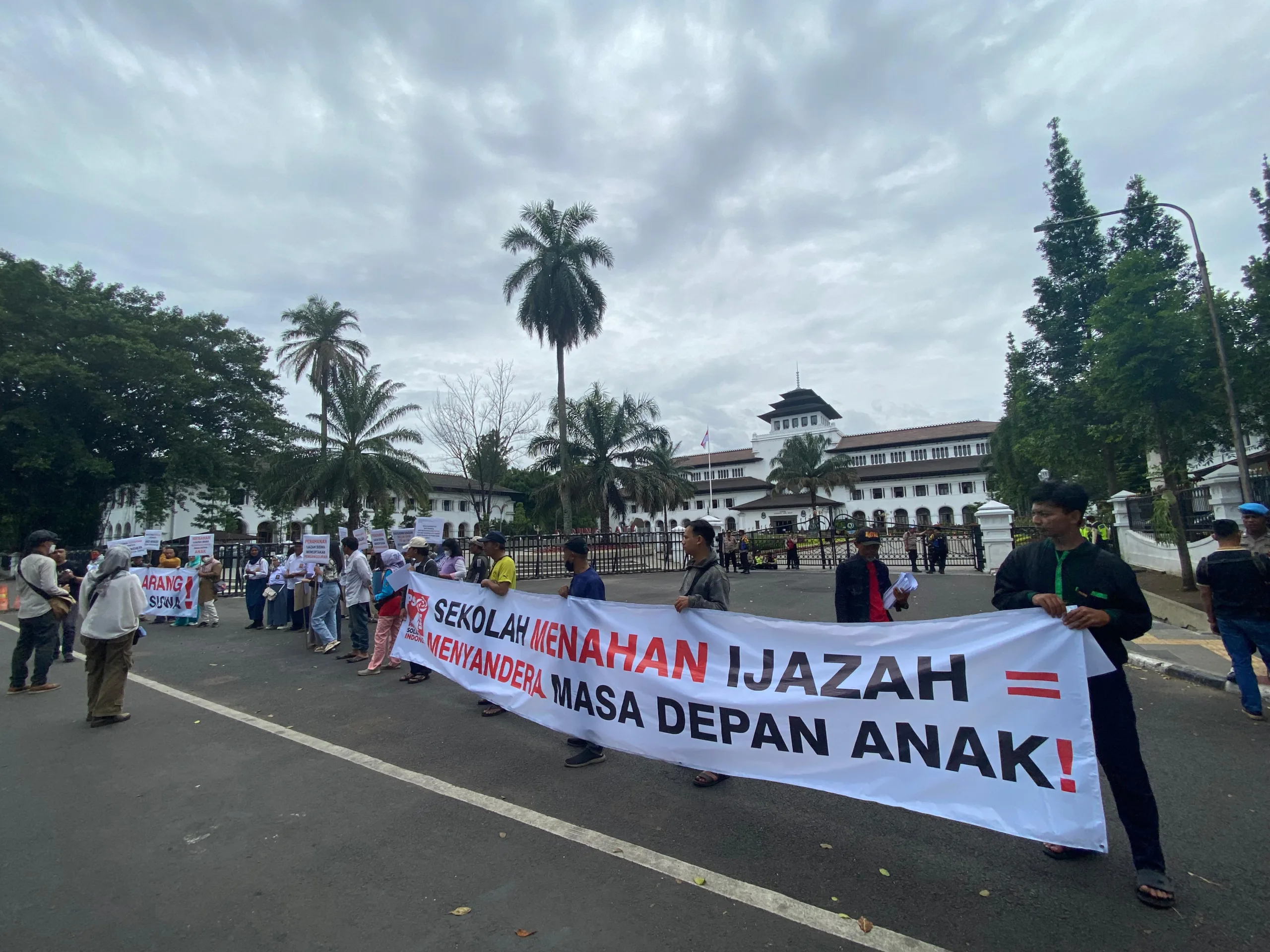 Bandung || Puluhan orang tua siswa dari berbagai sekolah yang ditahan ijazahnya melakukan aksi simpatik di depan gedung sate dengan membentangkan dua spanduk panjang. Spanduk pertama bertuliskan: