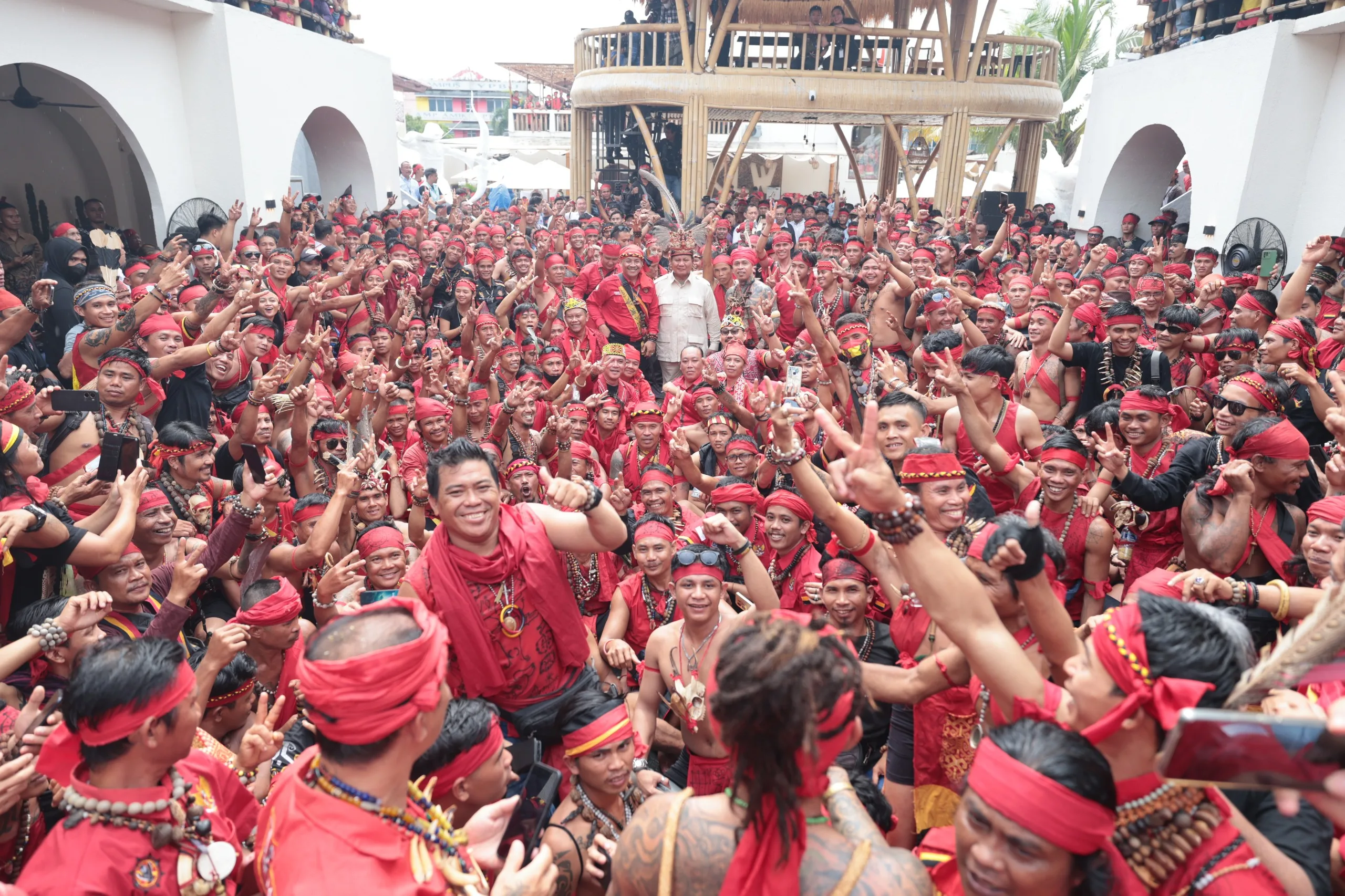Prabowo juga turut disambut dengan disematkannya topi adat Dayak dan juga rompi bermotif khas Dayak yang dipasangkan langsung oleh Panglima Jilah.