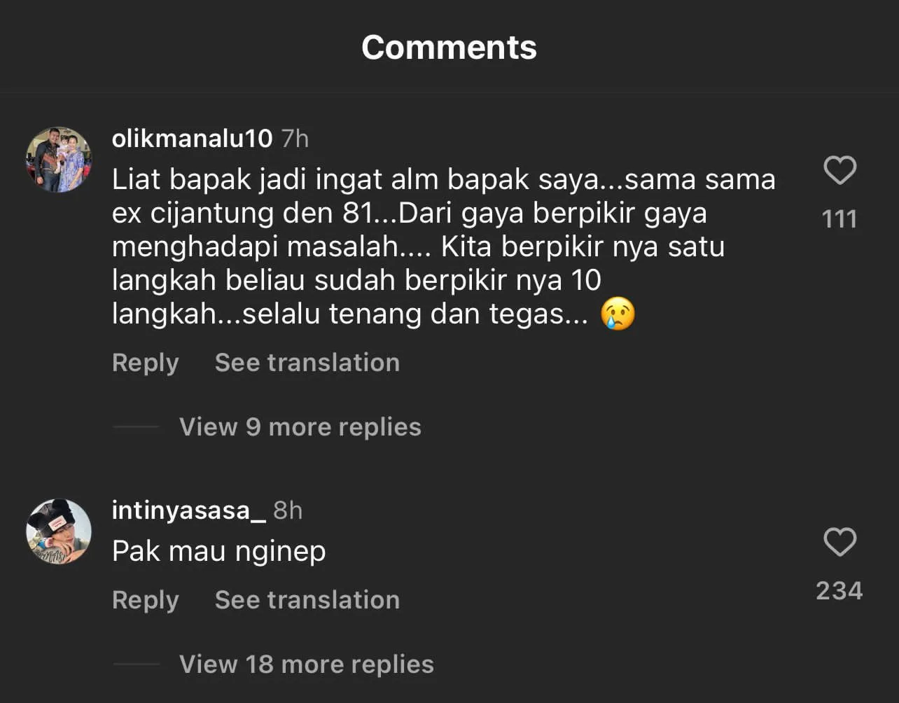 “Lihat bapak jadi ingat almarhum bapak saya, sama-sama eks Cijantung dan 81. Dari gaya berpikir dan menghadapi masalah, kita berpikirnya satu langkah, beliau berpikirnya sudah 10 langkah. Selalu tenang dan tegas,” ujar akun @olikmanalu10.