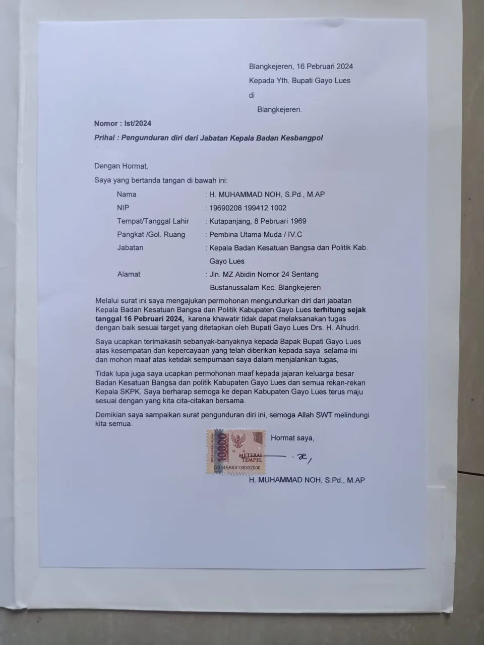 “Saya ucapkan terima kasih sebanyak-banyaknya kepada Bapak (Pj) Bupati Gayo Lues atas kesempatan dan kepercayaan yang telah diberikan kepada saya selama ini dan mohon maaf atas ketidaksempurnaan saya dalam menjalankan tugas,” kata Mohammad Noh dalam surat pengunduran diri di atas tanda tangan dan materai Rp10.000,- tersebut.
