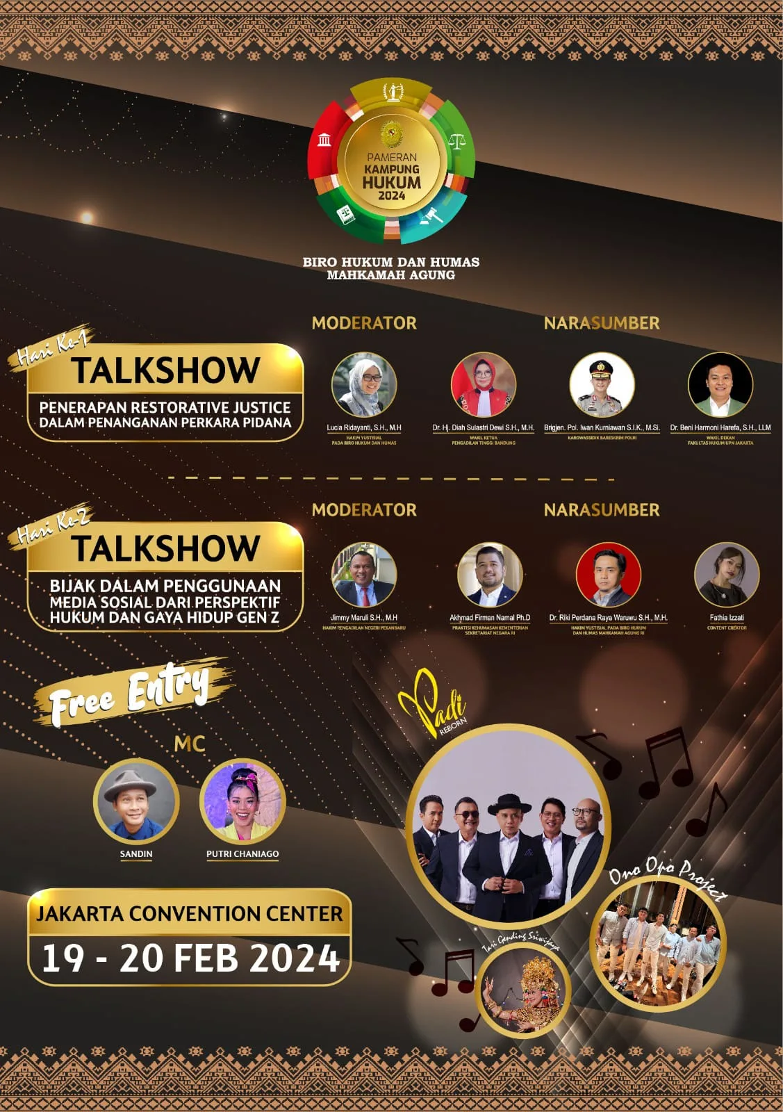 Jakarta | HSB – Setelah tiga tahun vakum karena Pandemi, tahun ini Mahkamah Agung Republik Indonesia kembali menyelenggarakan Pameran Kampung Hukum. Pameran akan dilaksanakan pada dua hari yaitu tanggal 19-20 Februari 2024 di Jakarta Convention Centre, Jakarta. Kegiatan ini akan dibuka secara resmi oleh Ketua Mahkamah Agung Prof. Dr. M. Syarifuddin, S.H., M.H. pada Senin pagi, 19 Februari 2024 pukul 09.00 WIB. Kegiatan ini turut dihadiri oleh Wakil Ketua Mahkamah Agung Bidang Yudisial, para Ketua Kamar, para pimpinan Lembaga peserta pameran, dan yang lainnya.