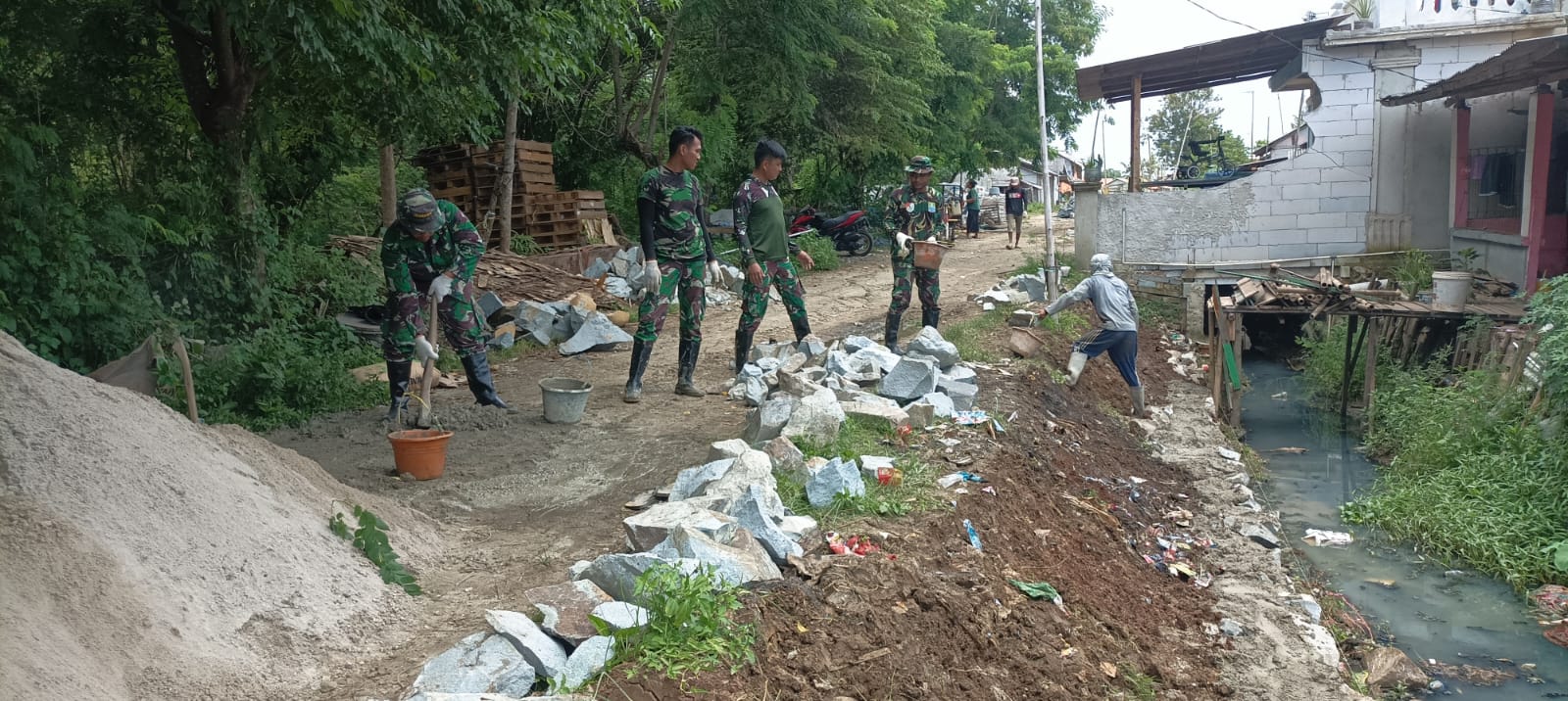 Pasiter Kodim 0509 Kabupaten Bekasi Kapten Arm Kurija mengatakan, secara gotong royong anggota Satgas TMMD bersama masyarakat mengerjakan sasaran fisik pembangunan turap saluran kali Embung Batu Beruem