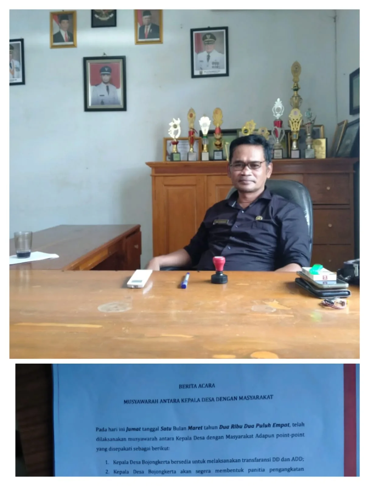 namun tidak seperti itu yang terjadi hari ini, karena awal mulanya begini, pada tanggal 1/3/2024 sebelum ada judul berita itu tayang tepatnya hari jumat, saya menerima kedatangan warga untuk bermusyawarah dengan membawa empat pertanyaan, diantaranya satu (1) keterbukaan atau transparansi dalam pemanfaatan ADD dan lain-lain, kedua (2) kekosongan perangkat desa, karena ada lebih dari dua orang perangkat yang memundurkan diri, yang ke (3) isu mempekerjakan pihak luar selain perangkat dalam menyelesaikan APBDES, kami mempertanyakan kenapa pihak luar selain perangkat, bisa melakukan pekerjaan yang memang notabenenya itu rahasia pemerintah desa, dan yang ke (4) tidak ada kejelasan masalah BUMDES, dan musyawarah hari itu clear dengan membuat surat keterangan berita acara musyawarah antara kepala desa dengan masyarakat, jelas kades.