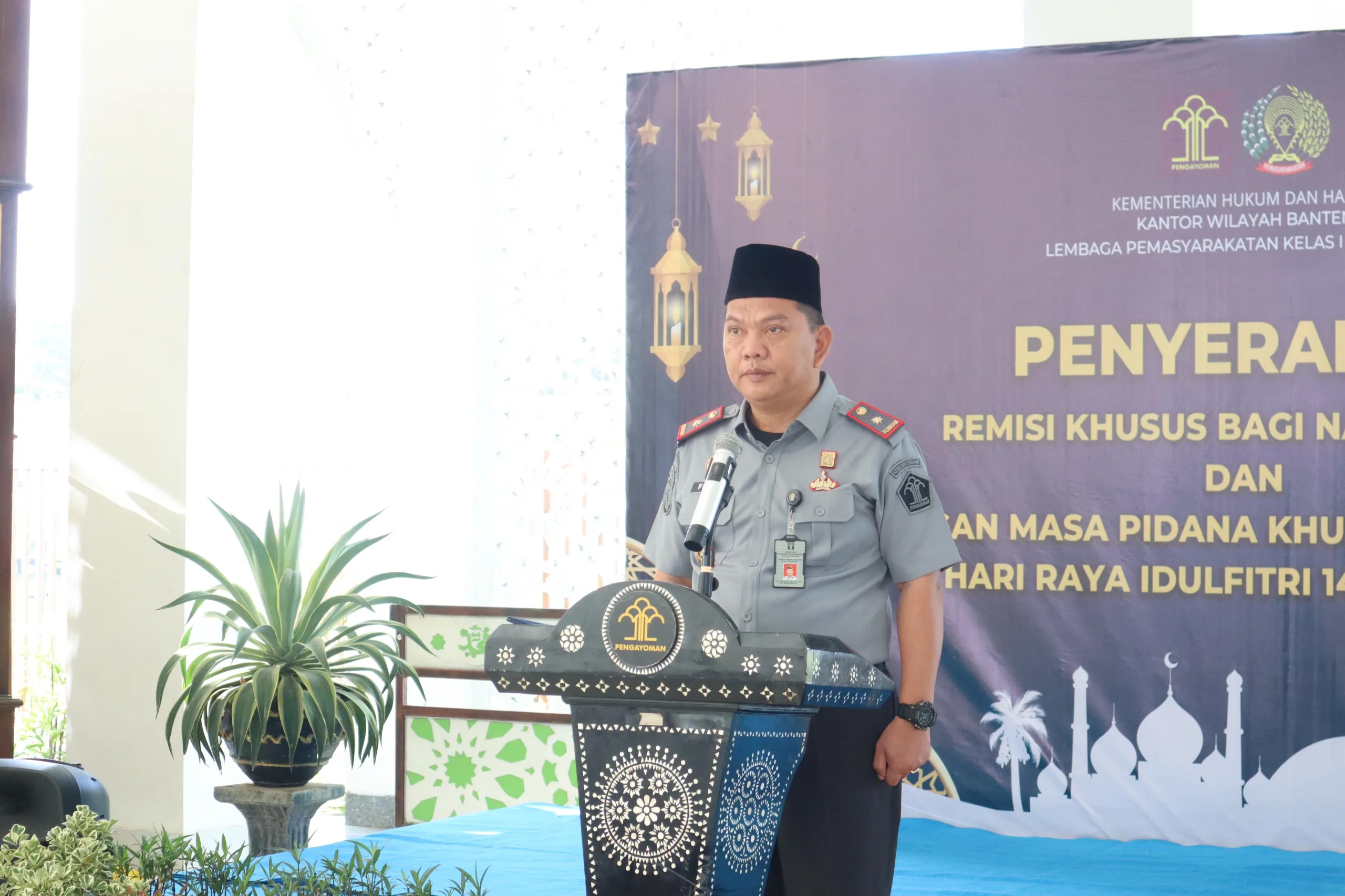 Kalapas Kelas I Tangerang, Fikri Jaya Soebing dalam sambutanya mengucapkan selamat merayakan Idul Fitri kepada seluruh jajaran pemasyarakatan yang bekerja ikhlas tanpa mengenal libur, tak lupa ucapan selamat kepada Warga Binaan yang mendapatkan Remisi jadikan ini sebagai momentum menjadikan pribadi yang lebih baik.
