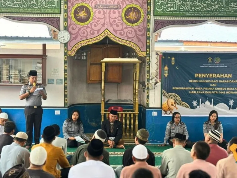 Setelah sebelumnya seluruh warga binaan melaksanakan Sholat Id Idul Fitri di Mesjid At-Taubah Rutan Pangkalan Brandan, acara dilanjutkan ke Penyerahan SK Remisi Khusus Idul Fitri 1445H. Dengan berlandaskan Surat Kepmenkumham RI Nomor PAS-600.PK.05.04 Tahun 2024 Tentang Pemberian Remisi Khusus (RK) Idul Fitri 1445H Tahun 2024 dan Pengurangan Masa Pidana Remisi Khusus (RK) Idul Fitri 1445H Tahun 2024, Ka. Rutan dan Jajaran laksanakan penyerahan Remisi Khusus Idul Fitri 1445H kepada 308 Warga Binaannya.
